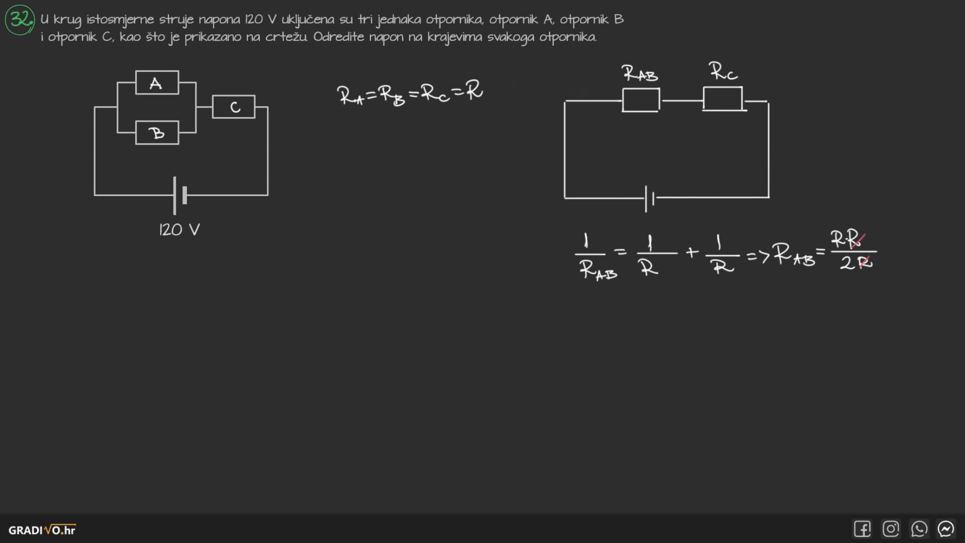 U krug istosmjerne struje napona 120 V uključena su tri jednaka otpornika, otpornik A, otpornik B i otpornik C, kao što je prikazano na crtežu. Odredite napon na krajevima svakoga otpornika.