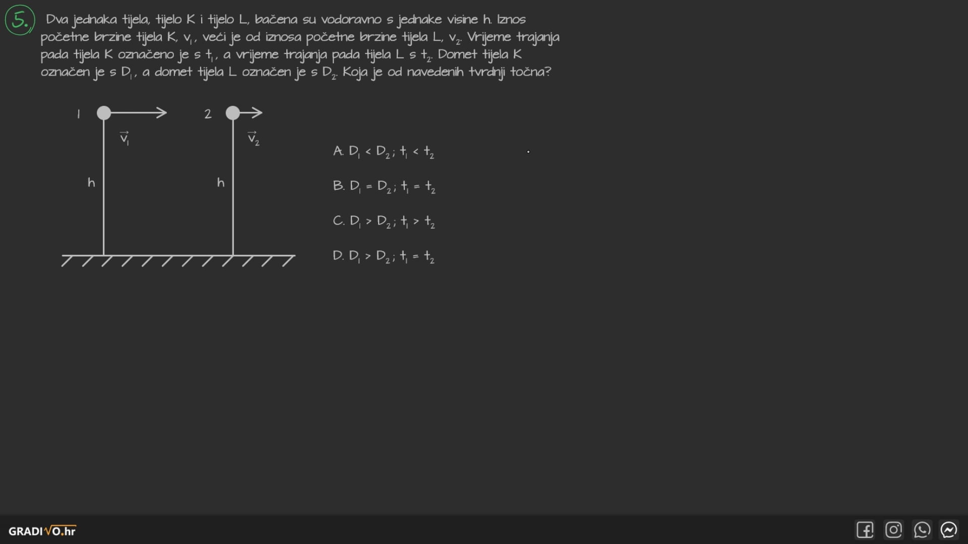 Dva jednaka tijela, tijelo K i tijelo L , bačena su vodoravno s jednake visine $h$. Iznos početne brzine tijela $\mathrm{K}, v_{1}$, veći je od iznosa početne brzine tijela $\mathrm{L}, v_{2}$. Vrijeme trajanja pada tijela $\mathrm{K}$ označeno je s $t_{1}$, a vrijeme trajanja pada tijela $\mathrm{L}$ s $t_{2}$. Domet tijela K označen je s$D_{1}$, a domet tijela L označen je s $D_{2}$. Koja je od navedenih tvrdnji točna?
