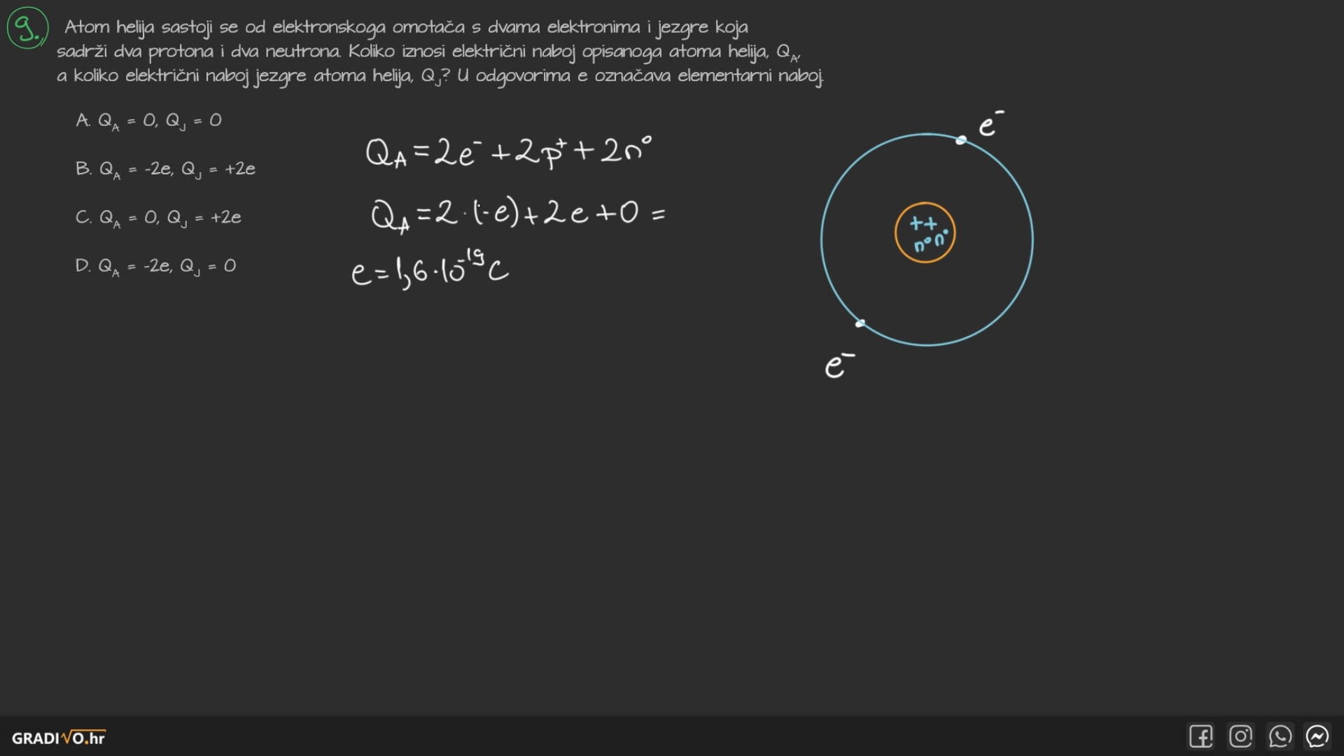 Atom helija sastoji se od elektronskoga omotača s dvama elektronima i jezgre koja sadrži dva protona i dva neutrona. Koliko iznosi električni naboj opisanoga atoma helija, $Q_{\mathrm{A}}$, a koliko električni naboj jezgre atoma helija, $Q_{\mathrm{J}}$ ? U odgovorima $e$ označava elementarni naboj.