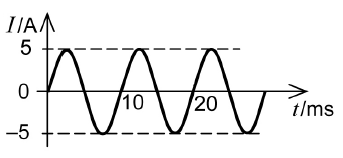 Otpornik otpora $100 \Omega$ spojen je u krug izmjenične struje. Graf prikazuje struju koja prolazi kroz otpornik u ovisnosti o vremenu. Koliki je maksimalni napon na otporniku?