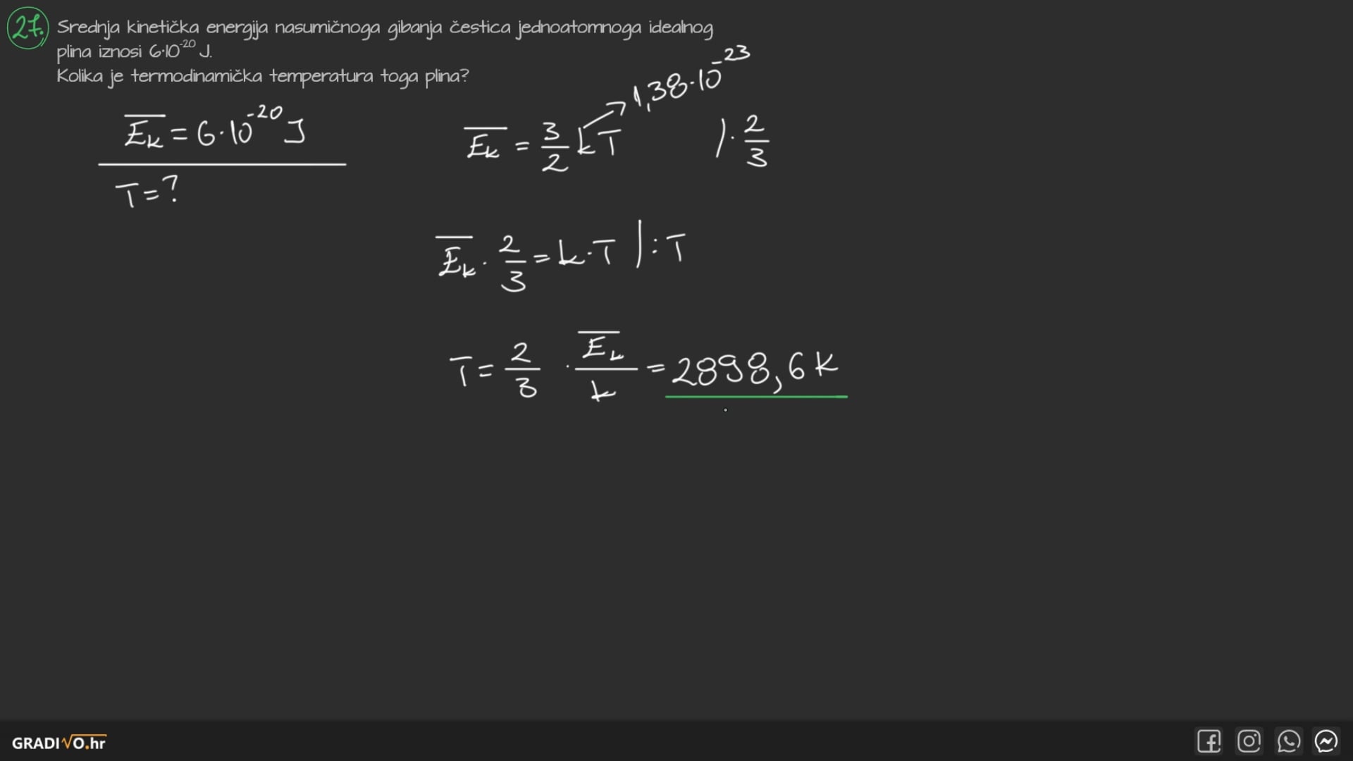 Srednja kinetička energija nasumičnoga gibanja čestica jednoatomnoga idealnog plina iznosi $6 \cdot 10^{-20} \mathrm{~J}$.