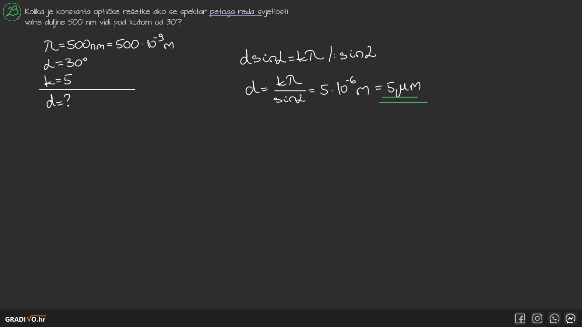 Kolika je konstanta optičke rešetke ako se spektar petoga reda svjetlosti valne duljine 500 nm vidi pod kutom od $30^{\circ}$ ?