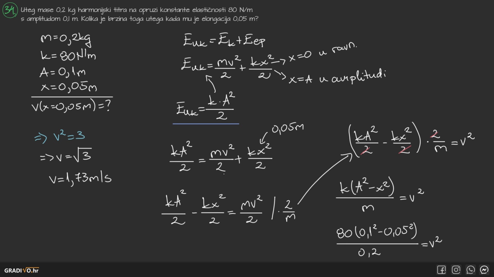 Uteg mase $0,2 \mathrm{~kg}$ harmonijski titra na opruzi konstante elastičnosti $80 \mathrm{~N} / \mathrm{m}$ s amplitudom $0,1 \mathrm{~m}$. Kolika je brzina toga utega kada mu je elongacija $0,05 \mathrm{~m}$ ?