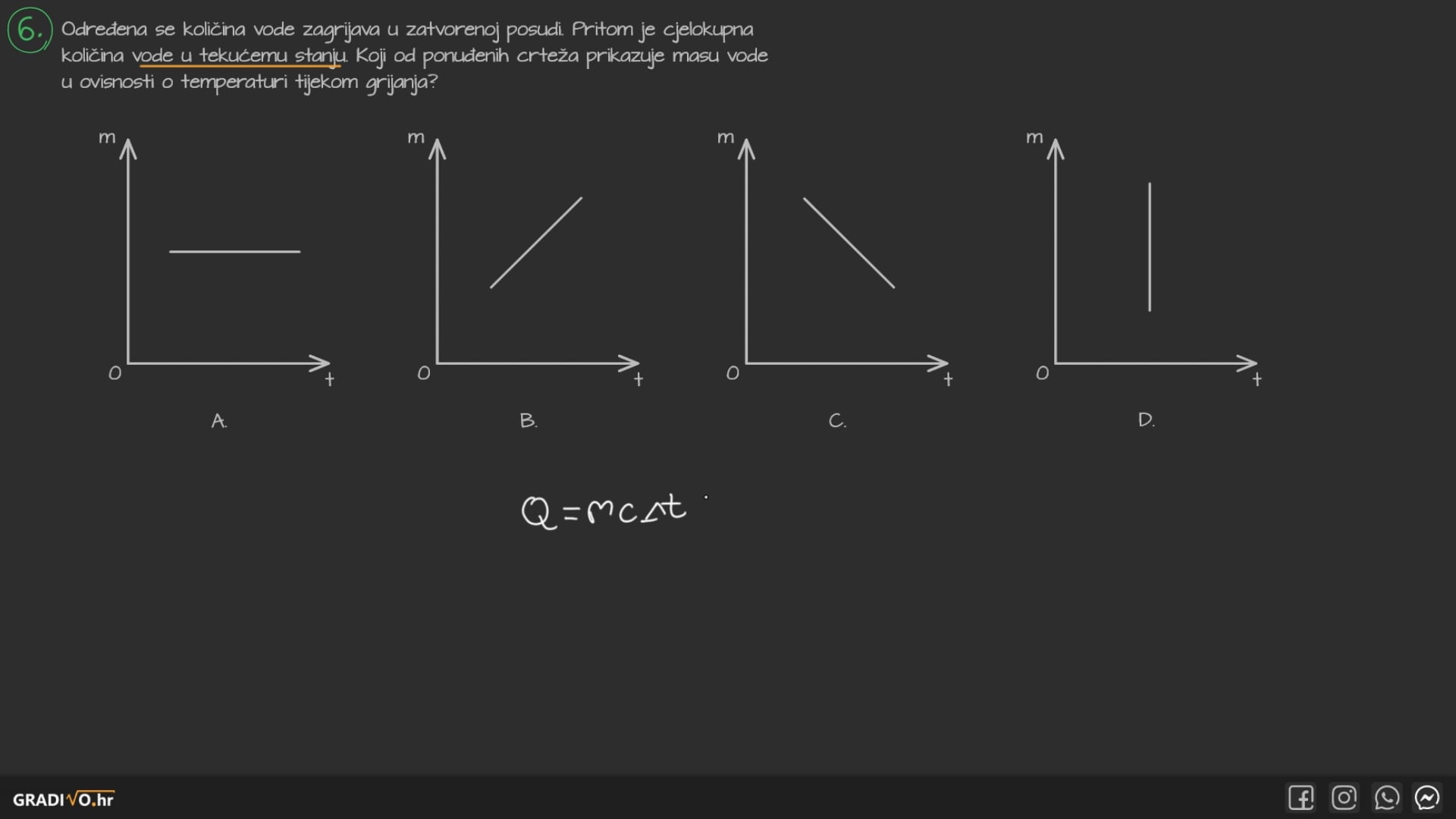 Određena se količina vode zagrijava u zatvorenoj posudi. Pritom je cjelokupna količina vode u tekućem stanju. Koji od ponuđenih crteža prikazuje masu vode u ovisnosti o temperaturi tijekom grijanja?