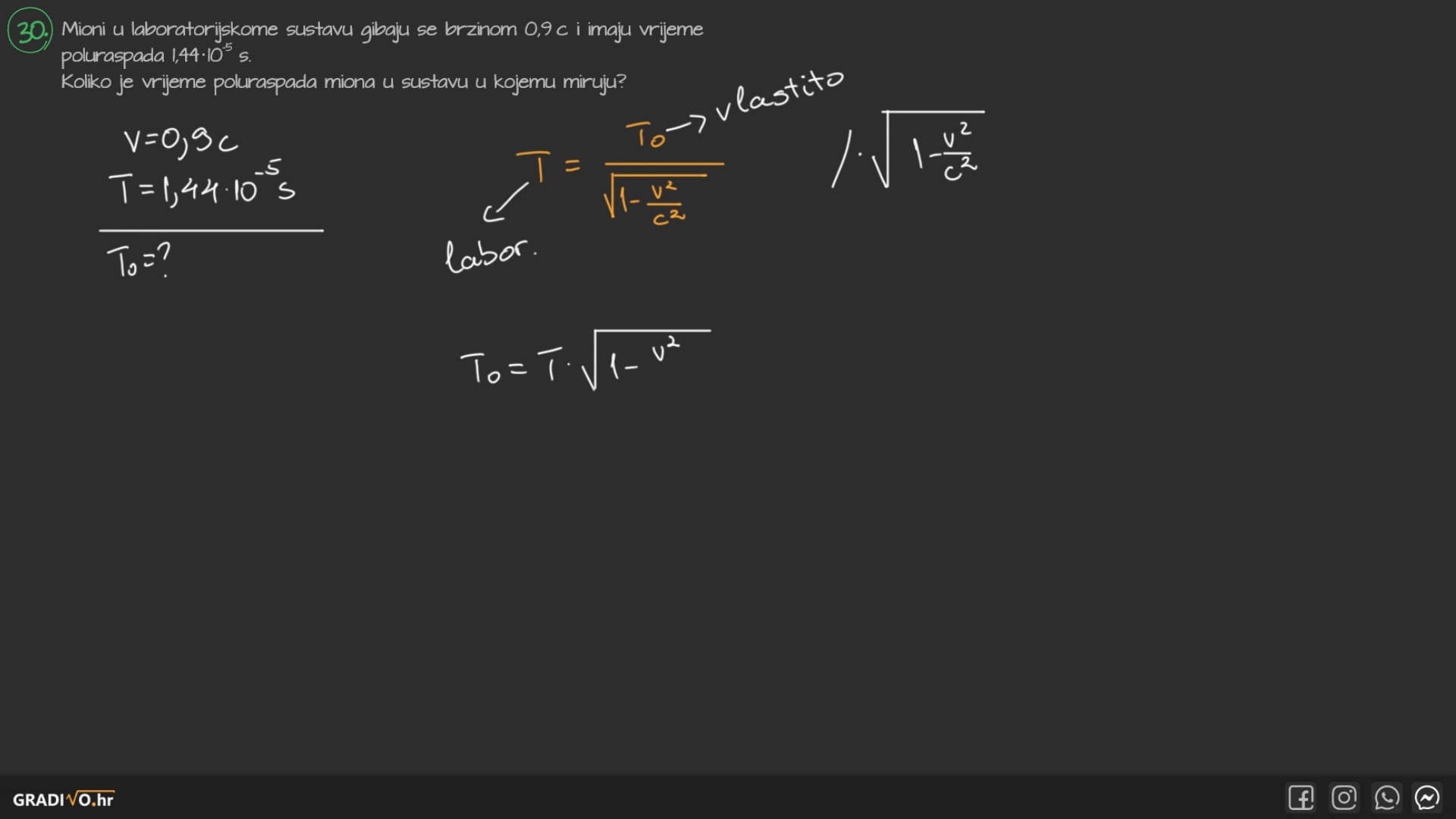 Mioni u laboratorijskome sustavu gibaju se brzinom 0,9 c i imaju vrijeme poluraspada $1,44 \cdot 10^{-5} \mathrm{~s}$. Koliko je vrijeme poluraspada miona u sustavu u kojemu miruju?