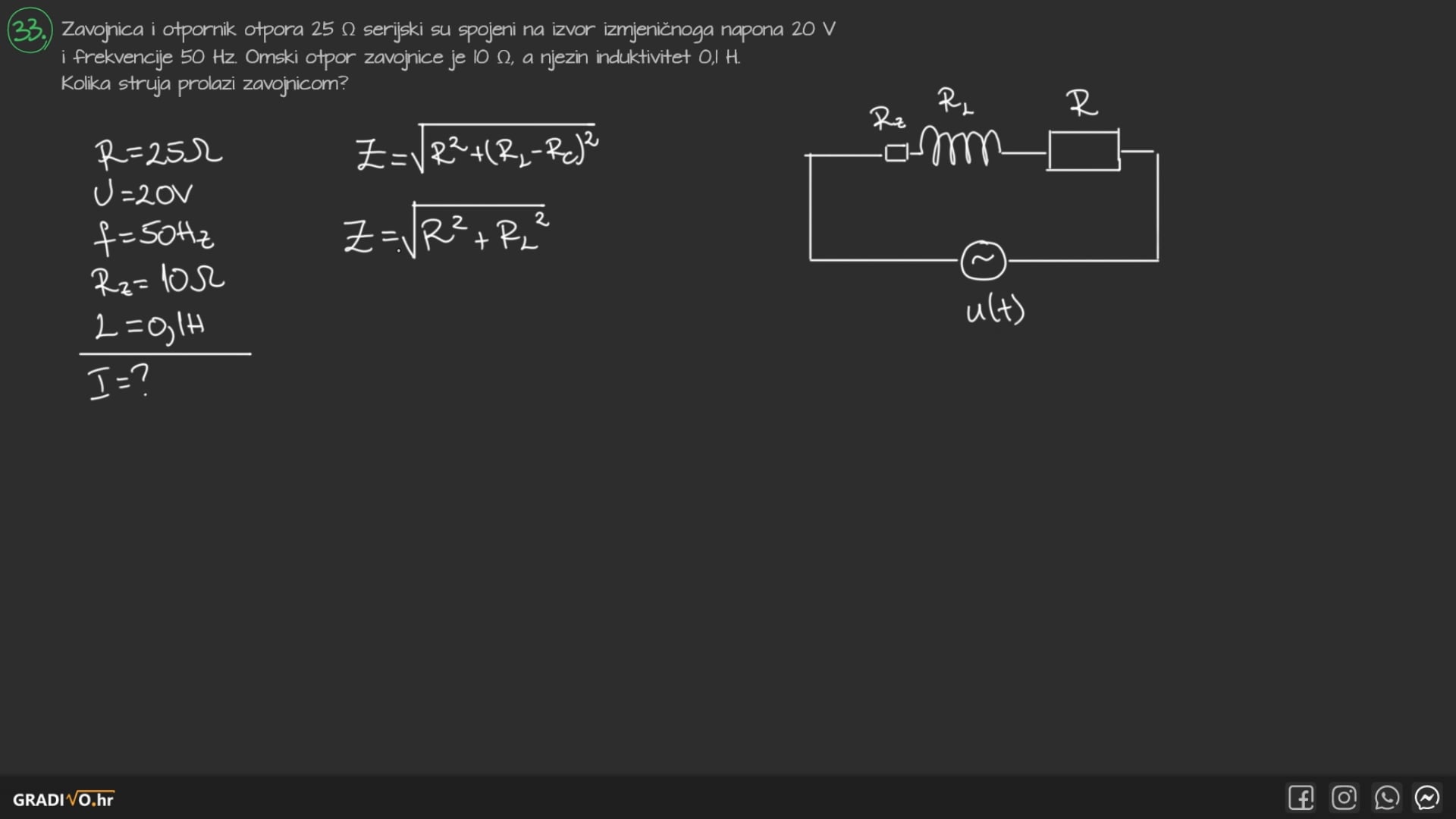 Zavojnica i otpornik otpora $25 \Omega$ serijski su spojeni na izvor izmjeničnoga napona 20 V i frekvencije 50 Hz . Omski otpor zavojnice je $10 \Omega$, a njezin induktivitet $0,1 \mathrm{H}$.\nKolika struja prolazi zavojnicom?\n\nPostupak: