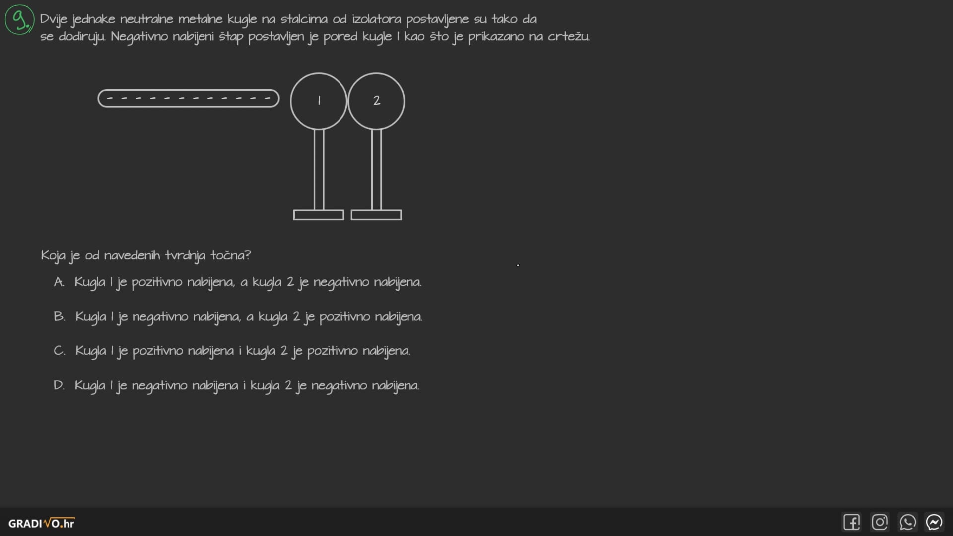 Dvije jednake neutralne metalne kugle na stalcima od izolatora postavljene su tako da se dodiruju. Negativno nabijeni štap postavljen je pored kugle 1 kao što je prikazano na crtežu.