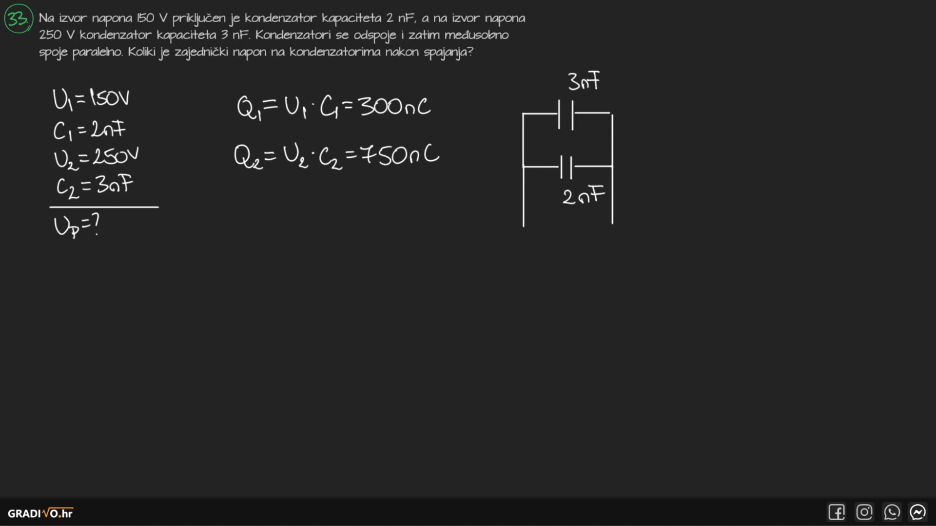Na izvor napona 150 V priključen je kondenzator kapaciteta 2 nF , a na izvor napona 250 V kondenzator kapaciteta 3 nF. Kondenzatori se odspoje i zatim međusobno spoje paraleIno. Koliki je zajednički napon na kondenzatorima nakon spajanja?