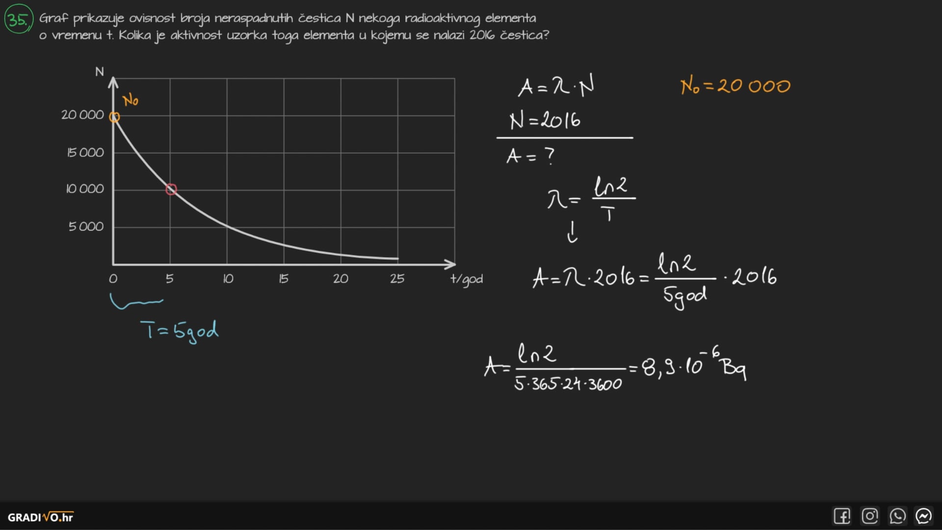Graf prikazuje ovisnost broja neraspadnutih čestica $N$ nekoga radioaktivnog elementa o vremenu $t$. Kolika je aktivnost uzorka toga elementa u kojemu se nalazi 2016 čestica?