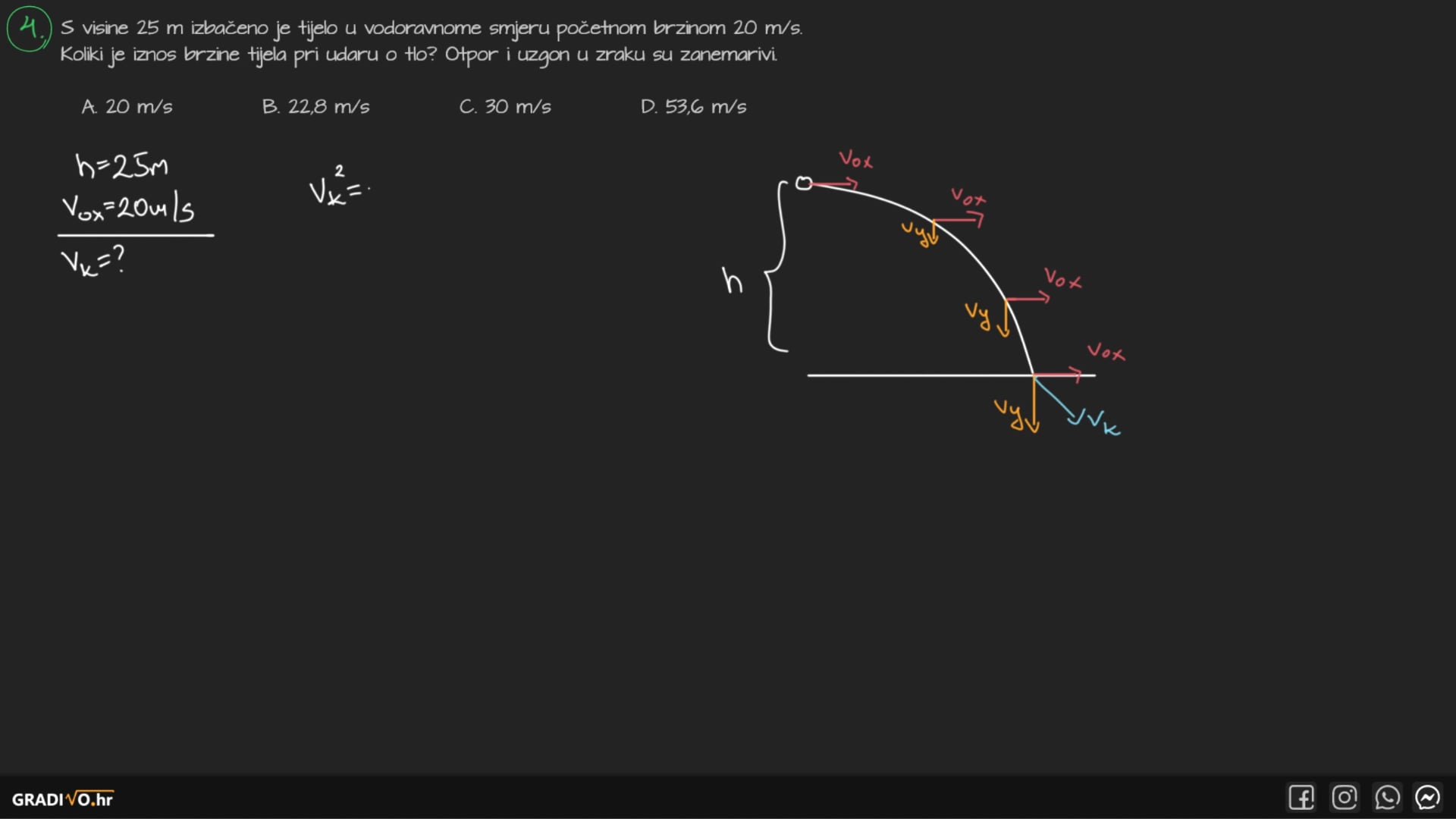 S visine 25 m izbačeno je tijelo u vodoravnome smjeru početnom brzinom $20 \mathrm{~m} / \mathrm{s}$. Koliki je iznos brzine tijela pri udaru o tlo? Otpor i uzgon u zraku su zanemarivi.