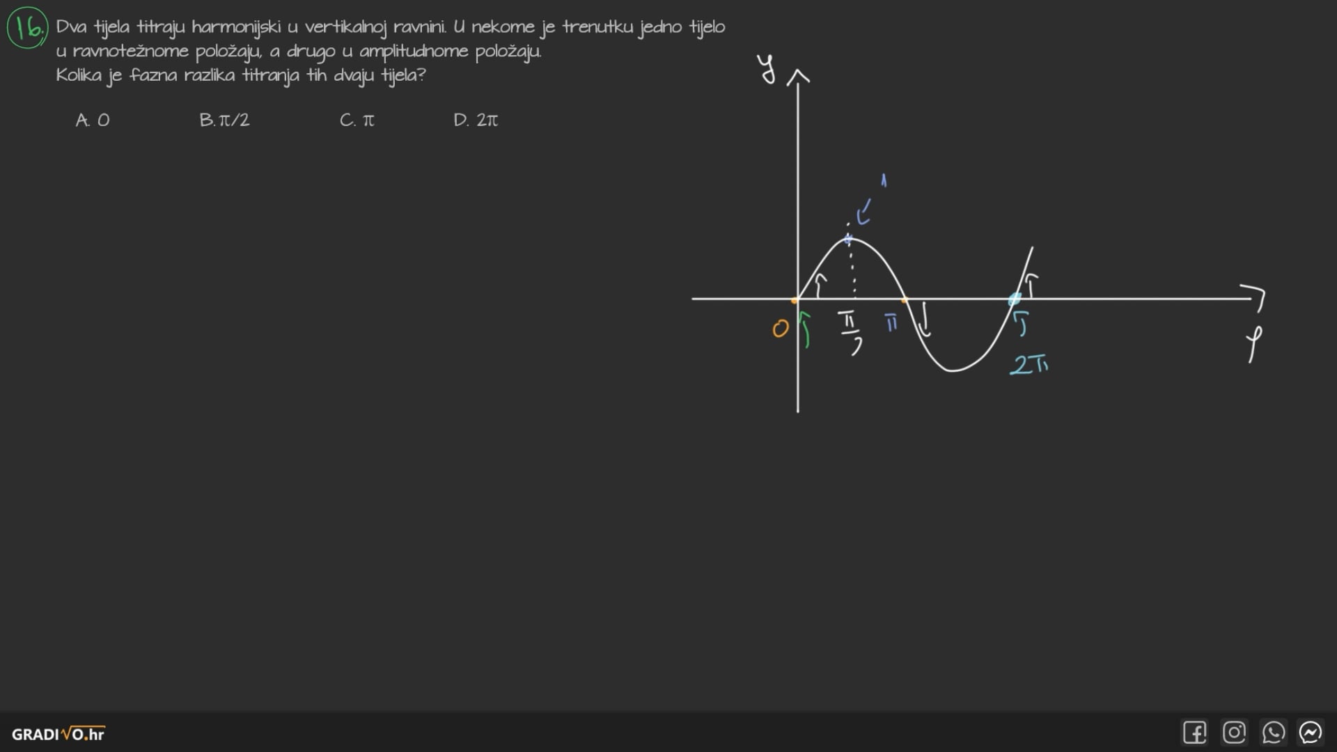 Dva tijela titraju harmonijski u vertikalnoj ravnini. U nekome je trenutku jedno tijelo u ravnotežnome položaju, a drugo u amplitudnome položaju. Kolika je fazna razlika titranja tih dvaju tijela?