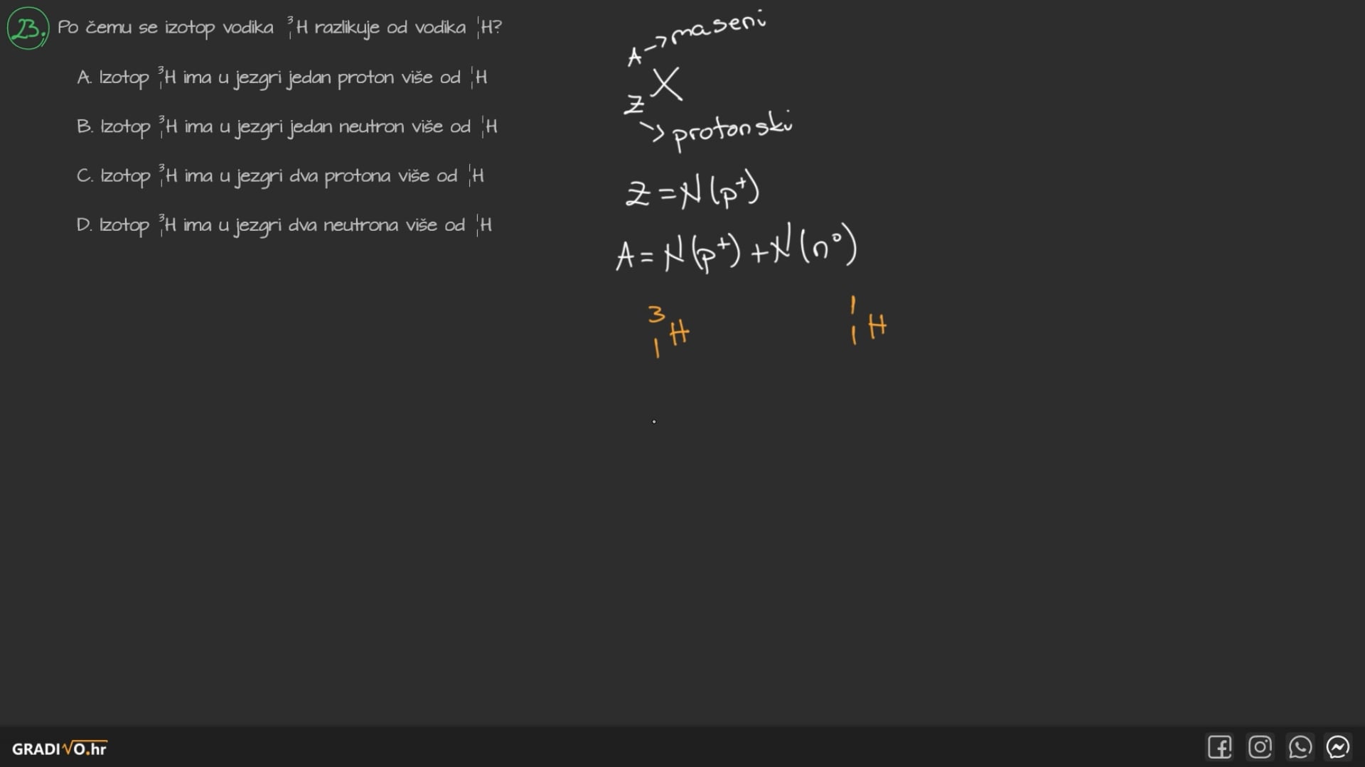 D. Izotop ${ }_{1}^{3} \mathrm{H}$ ima u jezgri dva neutrona više od ${ }_{1}^{1} \mathrm{H}$.