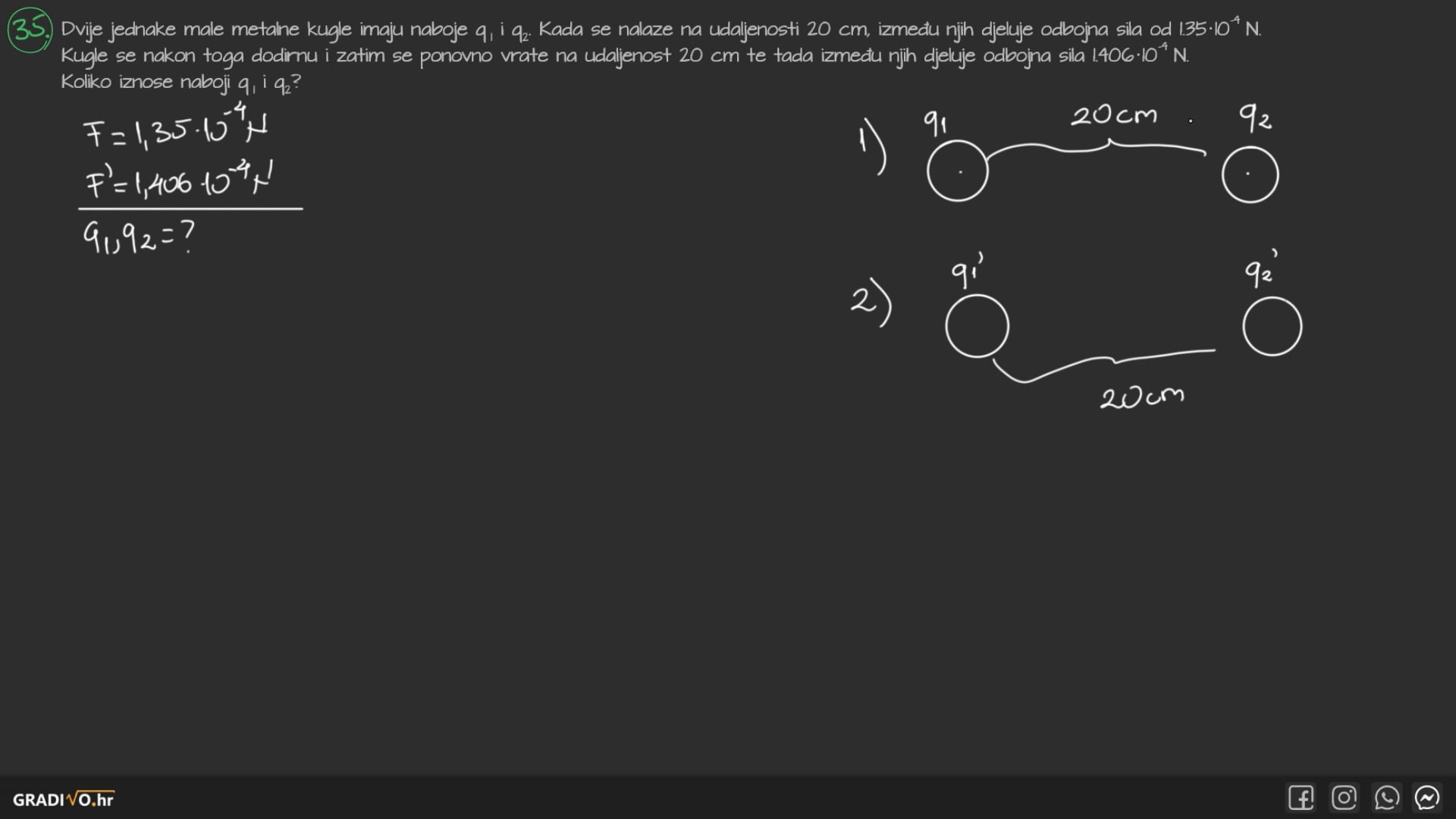 Dvije jednake male metalne kugle imaju naboje $q_{1}$ i $q_{2}$. Kada se nalaze na udaljenosti 20 cm , između njih djeluje odbojna sila od $1.35 \cdot 10^{-4} \mathrm{~N}$. Kugle se nakon toga dodirnu i zatim se ponovno vrate na udaljenost 20 cm te tada između njih djeluje odbojna sila $1.406 \cdot 10^{-4} \mathrm{~N}$. Koliko iznose naboji $q_{1}$ i $q_{2}$ ?