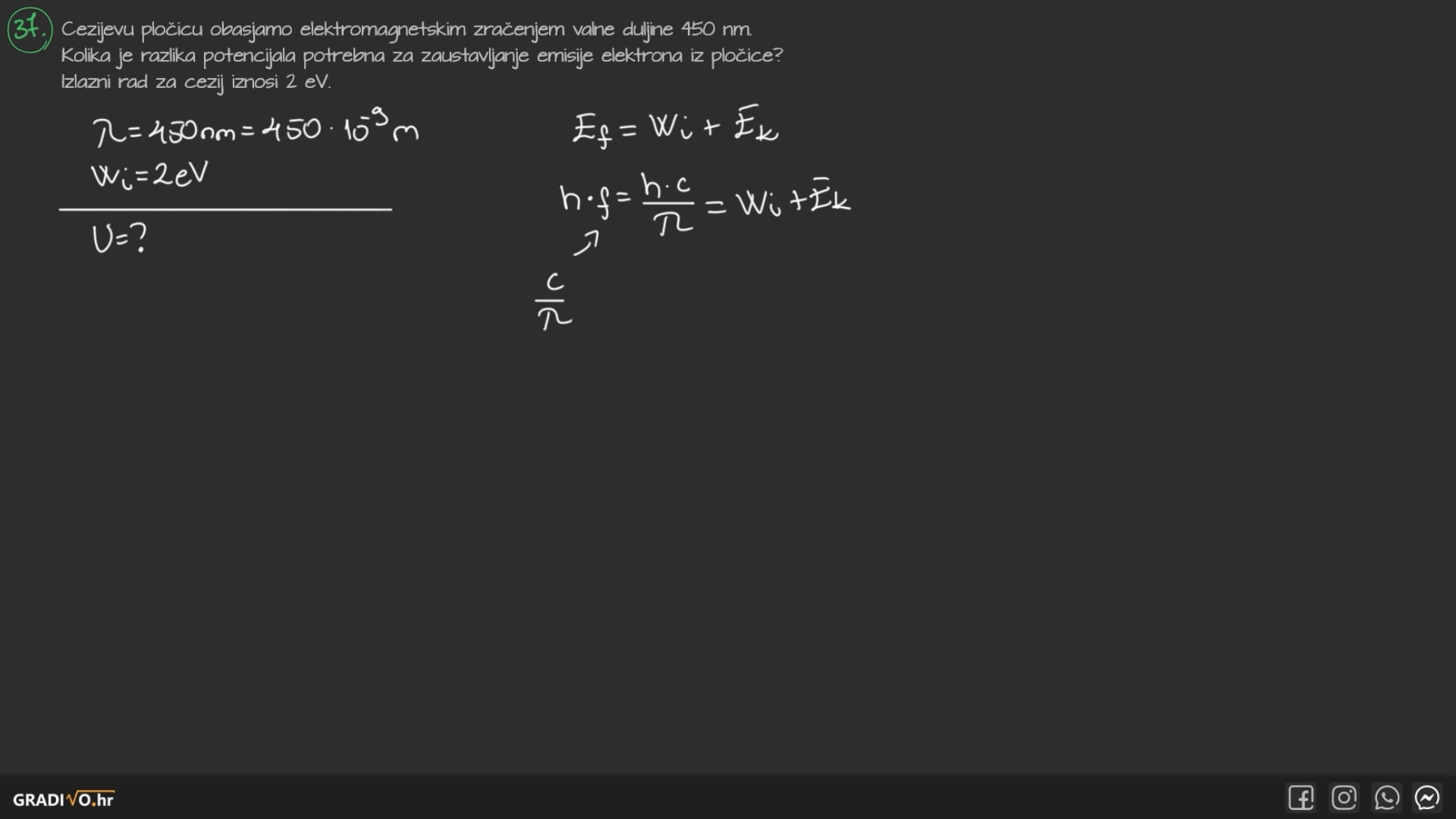 Cezijevu pločicu obasjamo elektromagnetskim zračenjem valne duljine 450 nm . Kolika je razlika potencijala potrebna za zaustavljanje emisije elektrona iz pločice? Izlazni rad za cezij iznosi 2 eV .