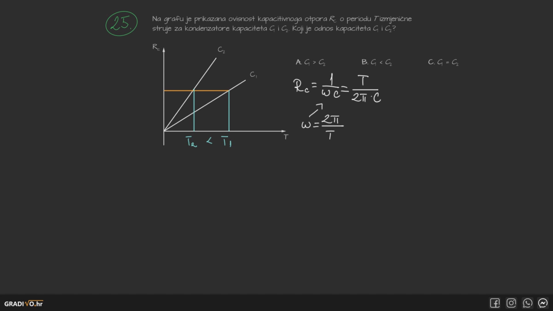 Na grafu je prikazana ovisnost kapacitivnoga otpora $R_{\mathrm{C}}$ o periodu $T$ izmjenične struje za kondenzatore kapaciteta $C_{1}$ i $C_{2}$. Koji je odnos kapaciteta $C_{1}$ i $C_{2}$ ?
