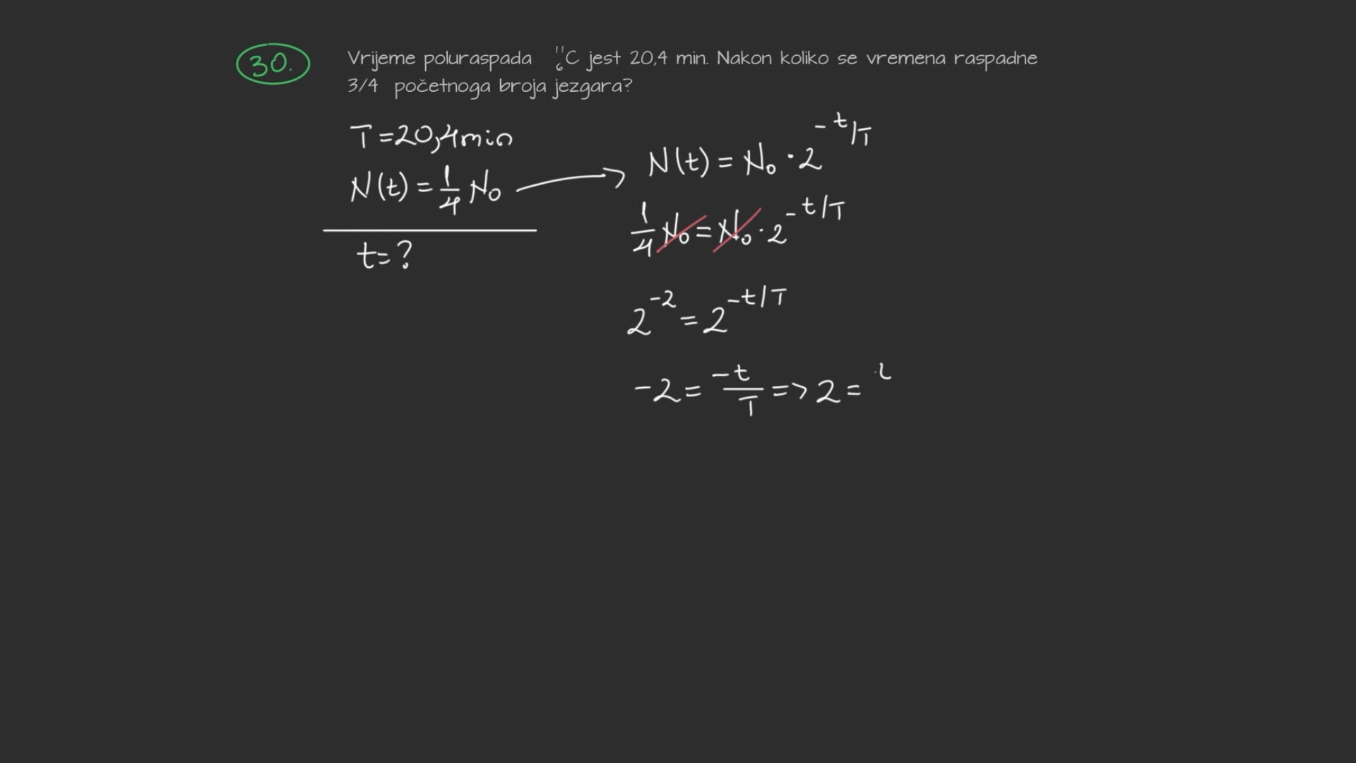 Vrijeme poluraspada ${ }_{6}^{11} \mathrm{C}$ jest 20,4 min. Nakon koliko se vremena raspadne $\frac{3}{4}$ početnoga broja jezgara?