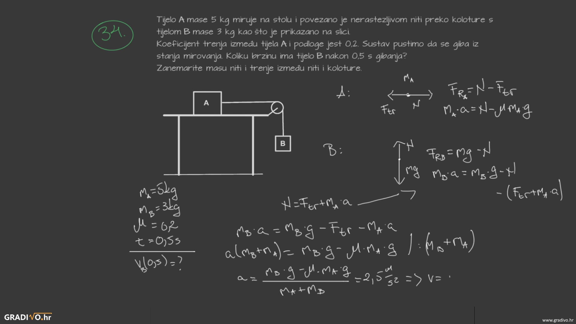 Koeficijent trenja između tijela A i podloge jest 0,2 . Sustav pustimo da se giba iz stanja mirovanja. Koliku brzinu ima tijelo B nakon $0,5 \mathrm{~s}$ gibanja? Zanemarite masu niti i trenje između niti i koloture.