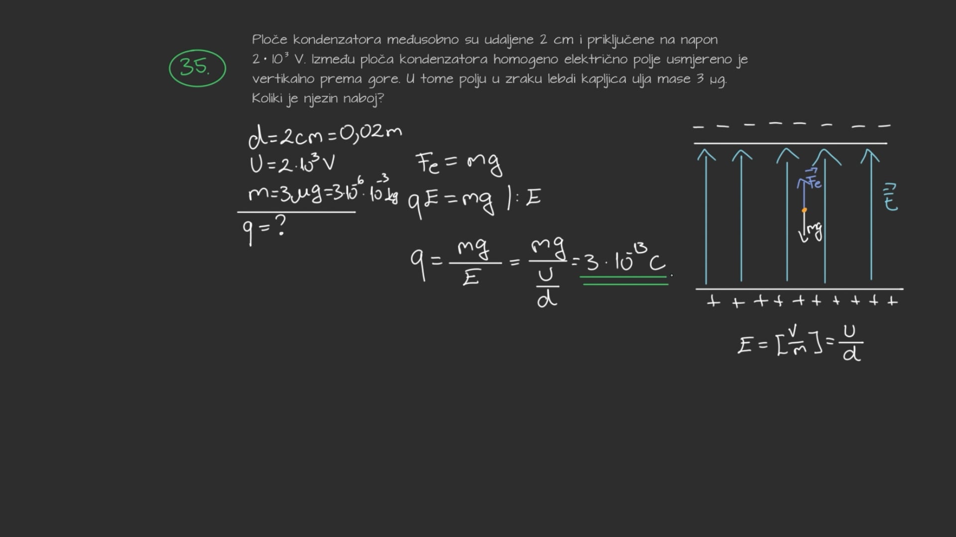 Ploče kondenzatora međusobno su udaljene 2 cm i priključene na napon $2 \cdot 10^{3} \mathrm{~V}$. Između ploča kondenzatora homogeno električno polje usmjereno je vertikalno prema gore. U tome polju u zraku lebdi kapljica ulja mase $3 \mu \mathrm{g}$. Koliki je njezin naboj?