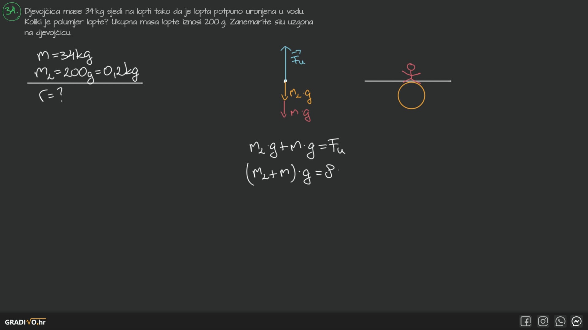 Djevojčica mase 34 kg sjedi na lopti tako da je lopta potpuno uronjena u vodu. Koliki je polumjer lopte? Ukupna masa lopte iznosi 200 g . Zanemarite silu uzgona na djevojčicu.