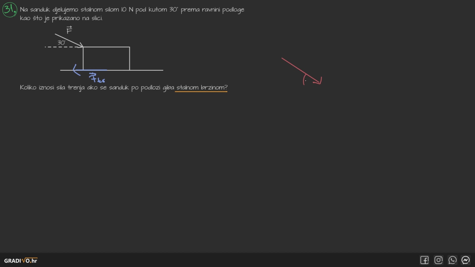 Na sanduk djelujemo stalnom silom 10 N pod kutom $30^{\circ}$ prema ravnini podloge kao što je prikazano na slici.