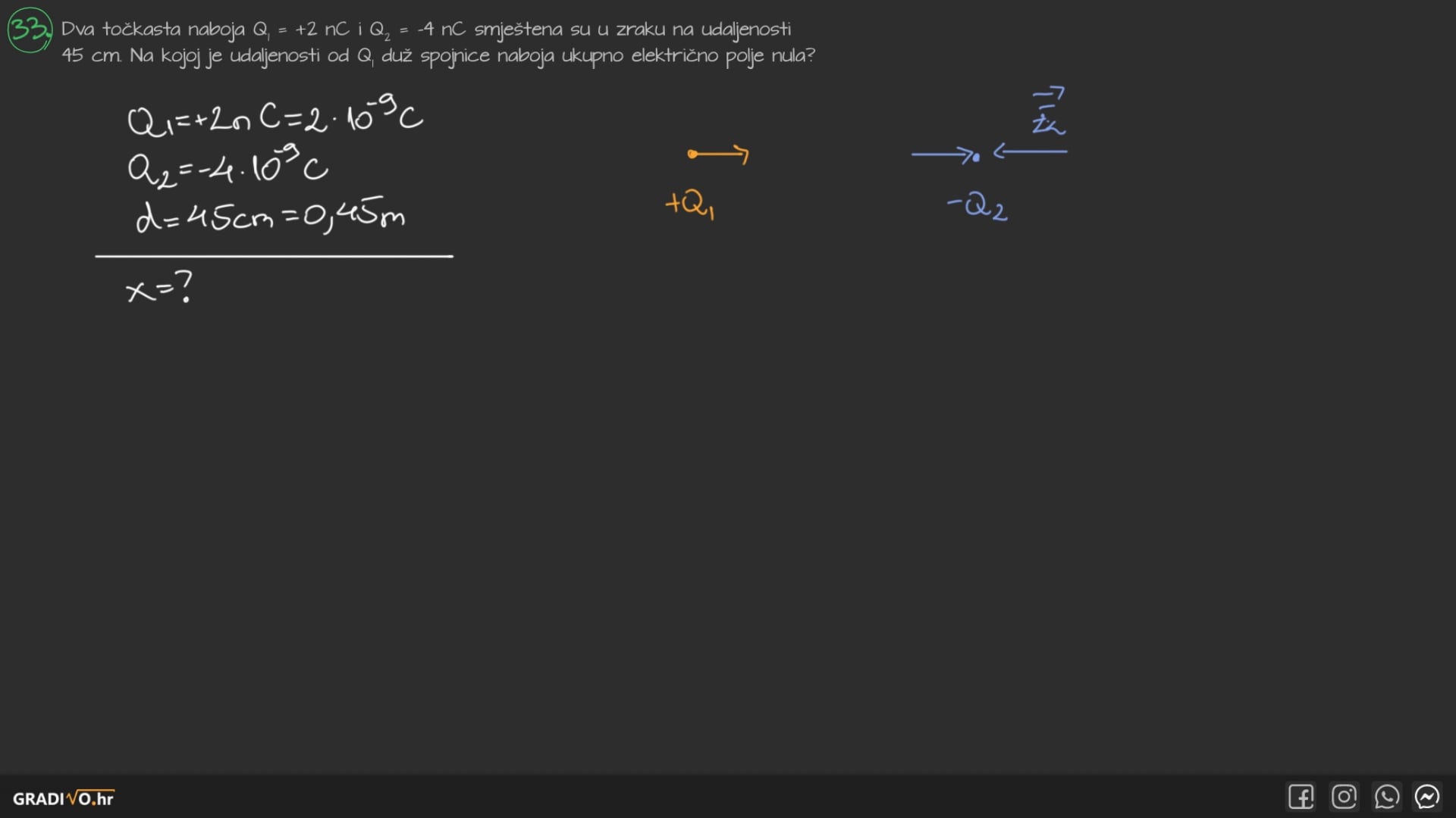 Dva točkasta naboja $Q_{1}=+2 \mathrm{nCi}$ $Q_{2}=-4 \mathrm{nC}$ smještena su u zraku na udaljenosti 45 cm . Na kojoj je udaljenosti od $Q_{1}$ duž spojnice naboja ukupno električno polje nula?