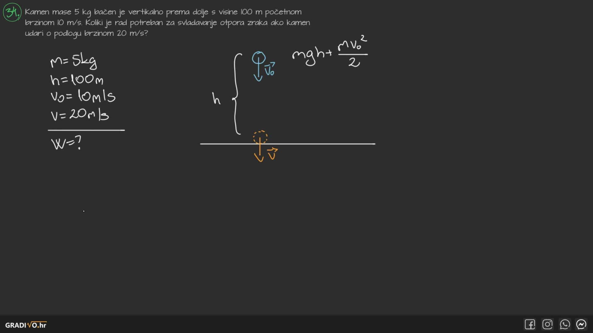 Kamen mase 5 kg bačen je vertikalno prema dolje s visine 100 m početnom brzinom $10 \mathrm{~m} / \mathrm{s}$. Koliki je rad potreban za svladavanje otpora zraka ako kamen udari o podlogu brzinom $20 \mathrm{~m} / \mathrm{s}$ ?