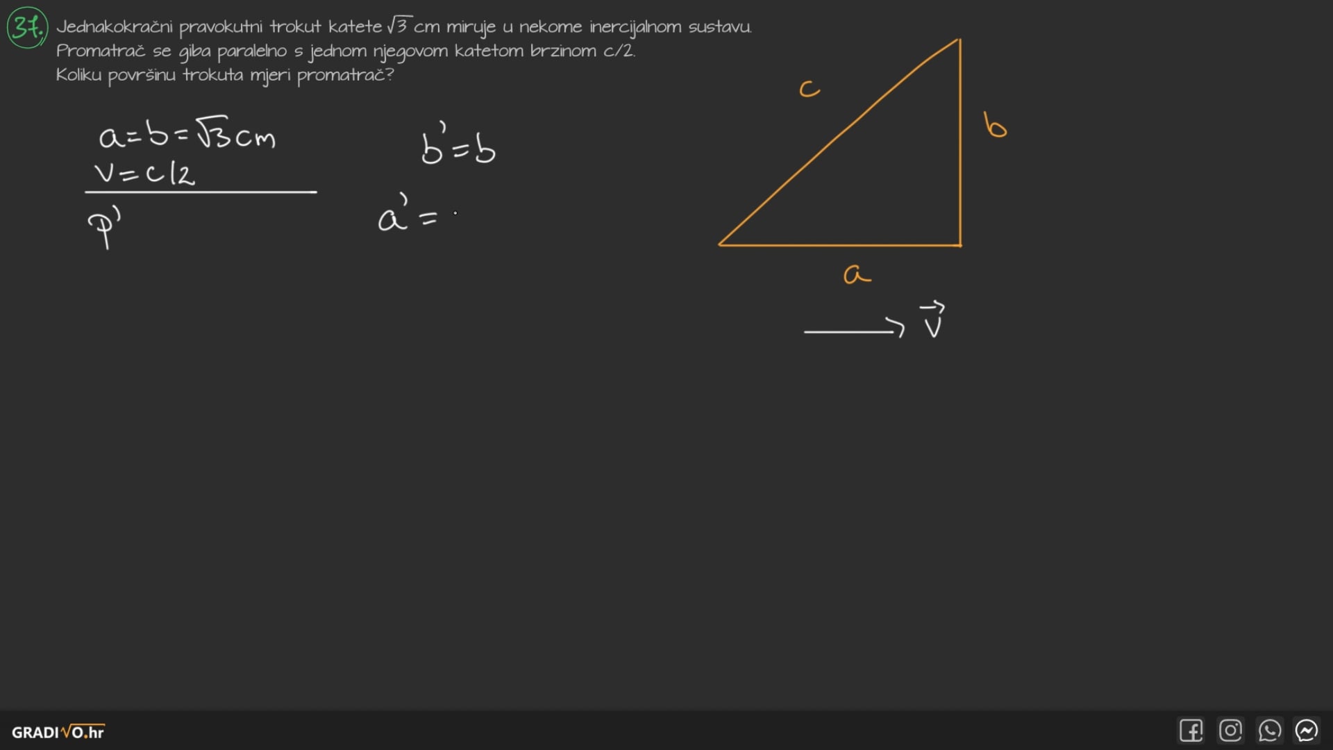 Jednakokračni pravokutni trokut katete $\sqrt{3} \mathrm{~cm}$ miruje u nekome inercijalnom sustavu. Promatrač se giba paralelno s jednom njegovom katetom brzinom $c / 2$. Koliku površinu trokuta mjeri promatrač?