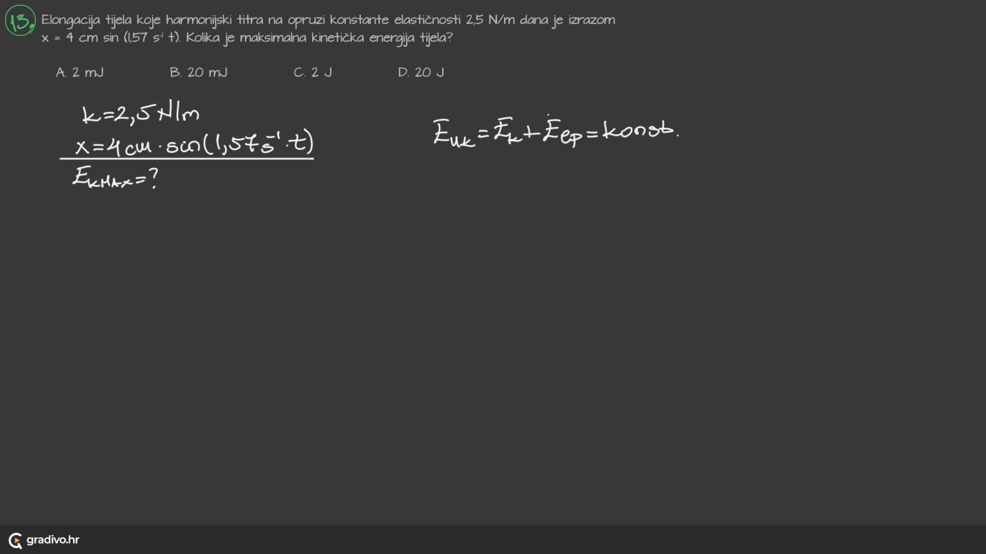 Elongacija tijela koje harmonijski titra na opruzi konstante elastičnosti $2,5 \mathrm{~N} / \mathrm{m}$ dana je izrazom $x=4 \mathrm{~cm} \sin \left(1,57 \mathrm{~s}^{-1} t\right)$. Kolika je maksimalna kinetička energija tijela?