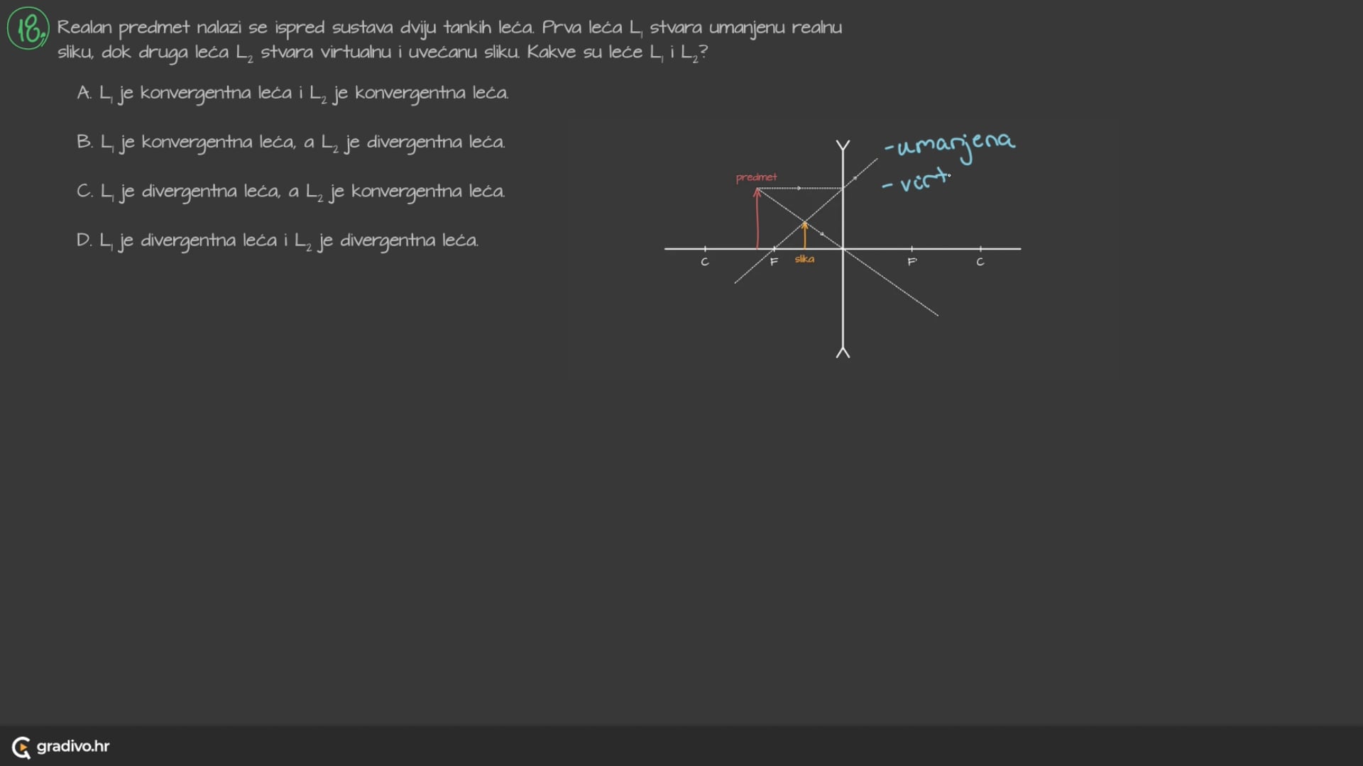 Realan predmet nalazi se ispred sustava dviju tankih leća. Prva leća $L_{1}$ stvara umanjenu realnu sliku, dok druga leća $L_{2}$ stvara virtualnu i uvećanu sliku. Kakve su leće $L_{1}$ i $L_{2}$ ?