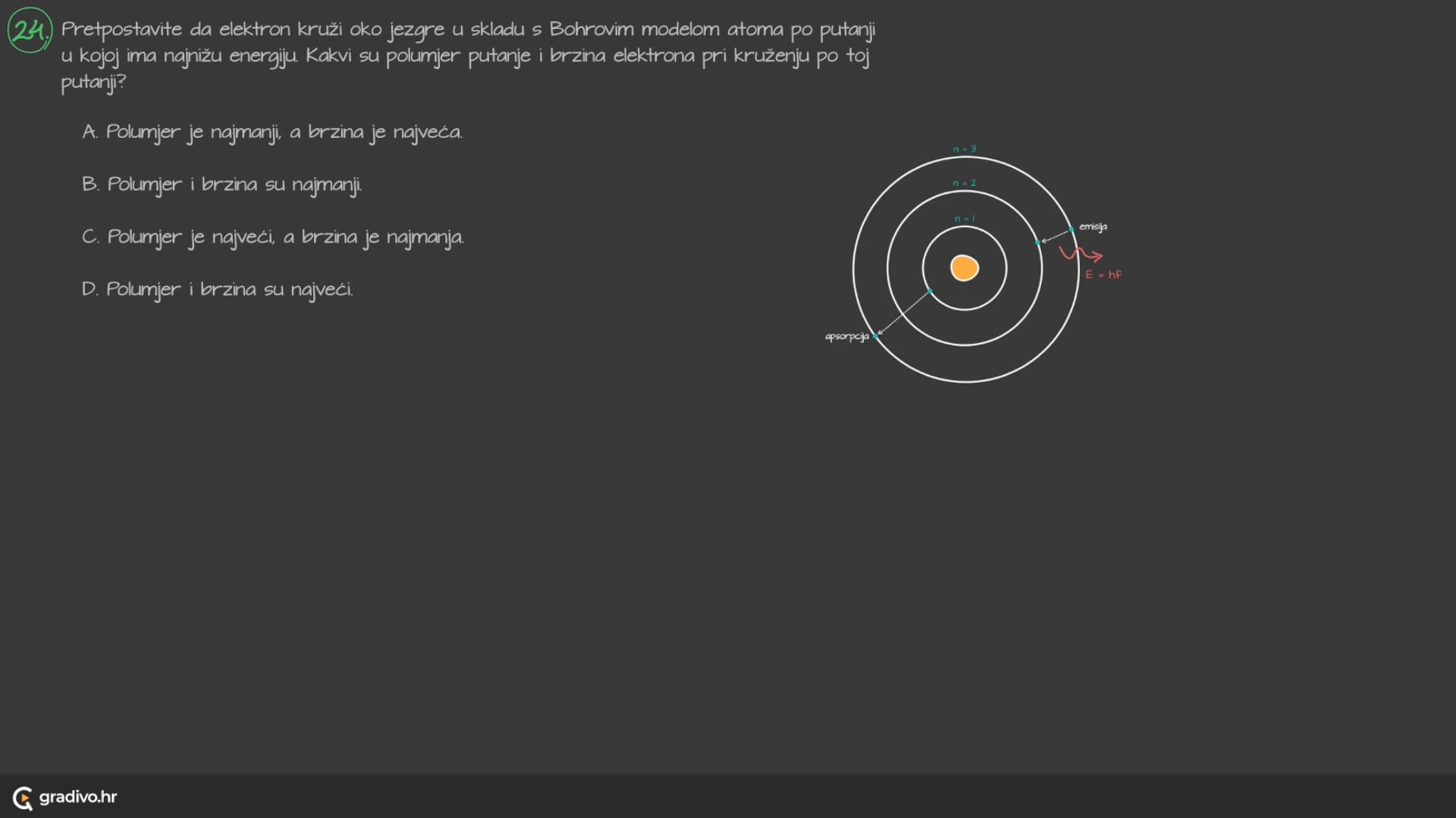 Pretpostavite da elektron kruži oko jezgre u skladu s Bohrovim modelom atoma po putanji u kojoj ima najnižu energiju. Kakvi su polumjer putanje i brzina elektrona pri kruženju po toj putanji?