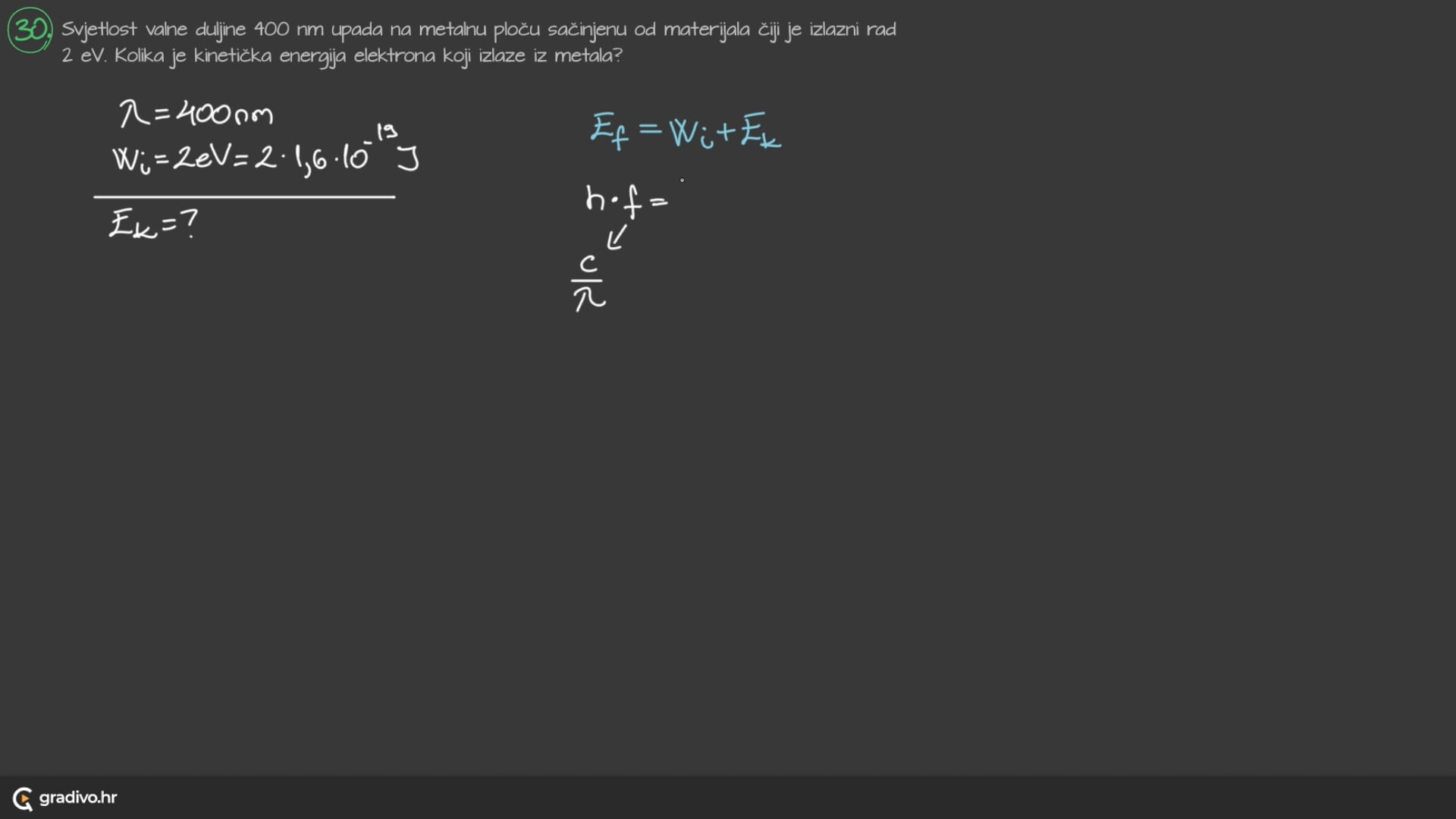 Svjetlost valne duljine 400 nm upada na metalnu ploču sačinjenu od materijala čiji je izlazni rad2 eV . Kolika je kinetička energija elektrona koji izlaze iz metala?