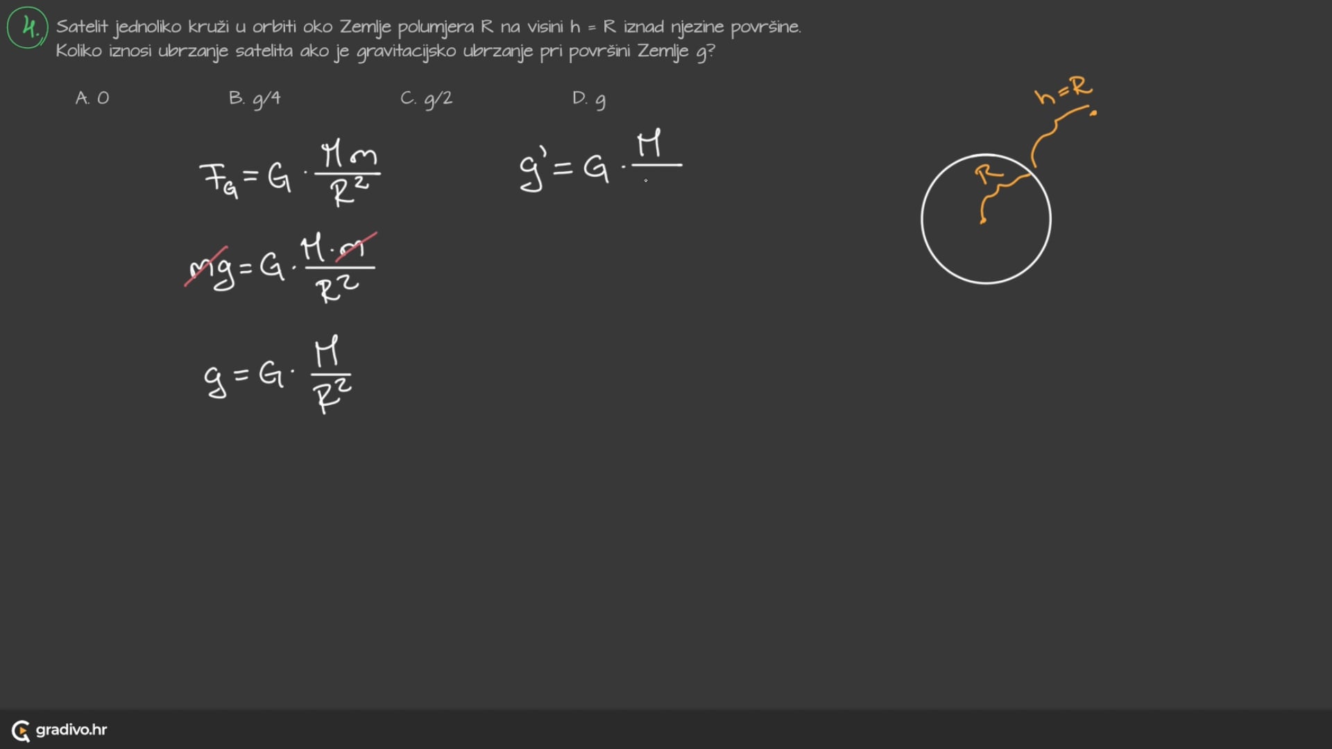 Satelit jednoliko kruži u orbiti oko Zemlje polumjera R na visini h=R iznad njezine površine. Koliko iznosi ubrzanje satelita ako je gravitacijsko ubrzanje pri površini Zemlje g ?