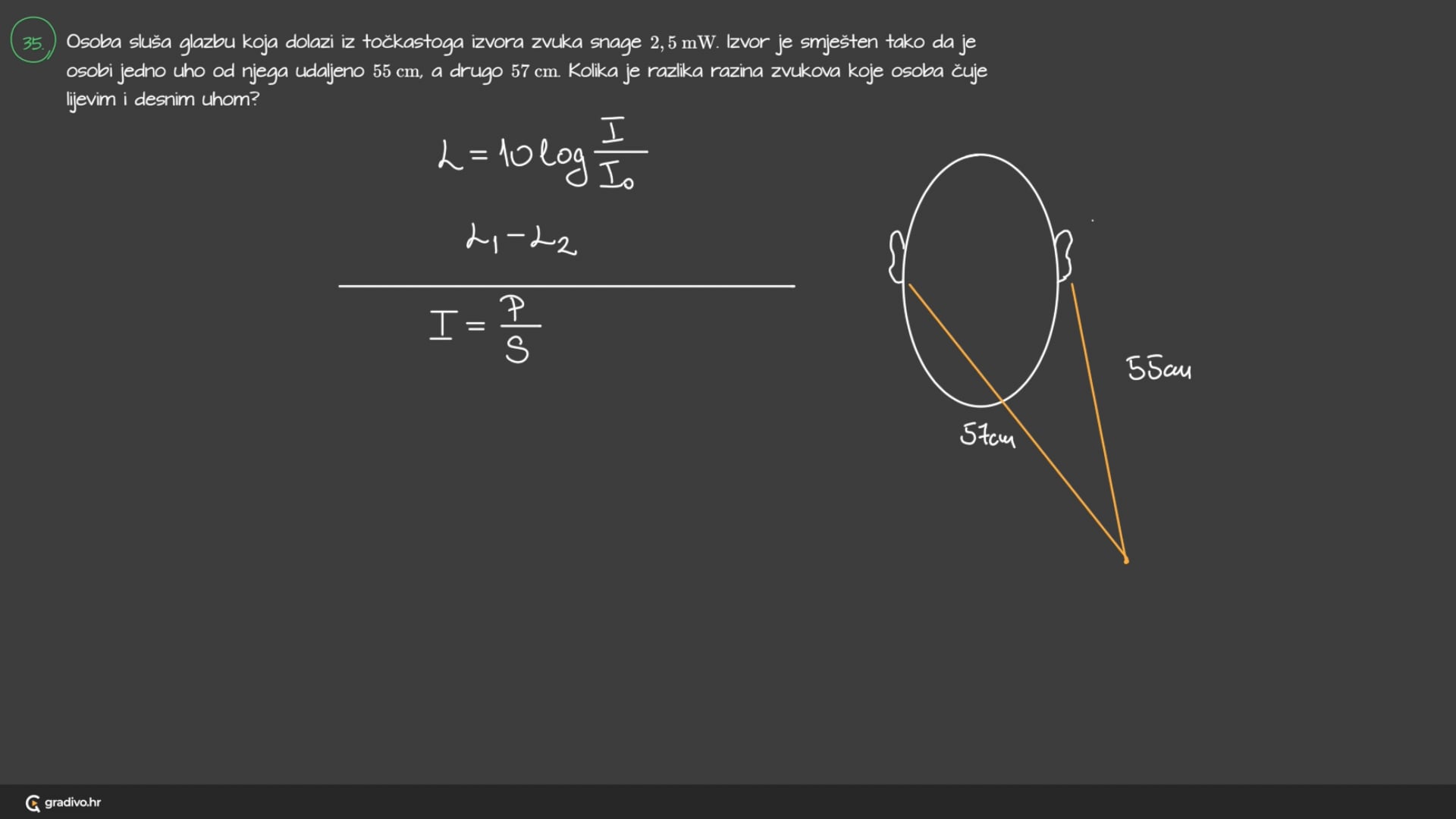 Osoba sluša glazbu koja dolazi iz točkastoga izvora zvuka snage $2,5 \mathrm{~mW}$. Izvor je smješten tako da je osobi jedno uho od njega udaljeno 55 cm , a drugo 57 cm . Kolika je razlika razina zvukova koje osoba čuje lijevim i desnim uhom?