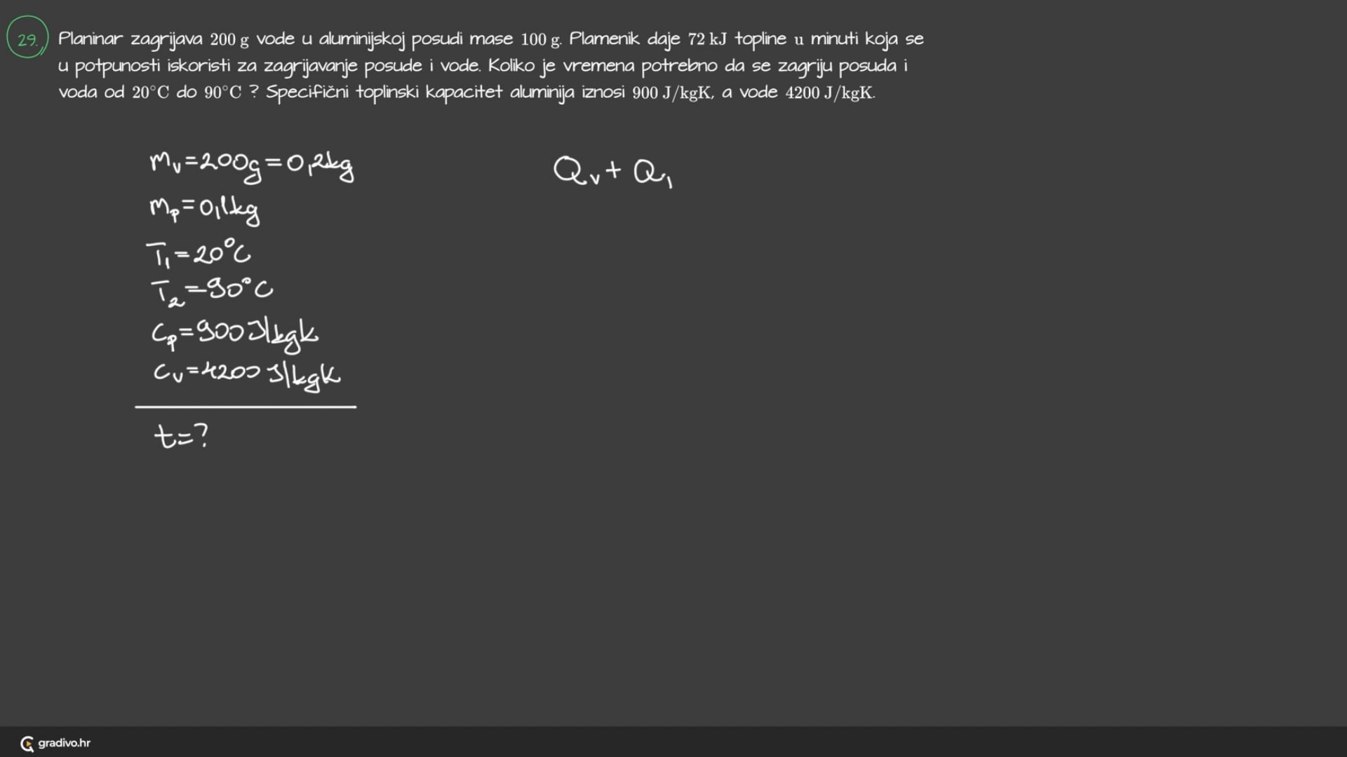 Planinar zagrijava 200 g vode u aluminijskoj posudi mase 100 g . Plamenik daje 72 kJ topline u minuti koja se u potpunosti iskoristi za zagrijavanje posude i vode.