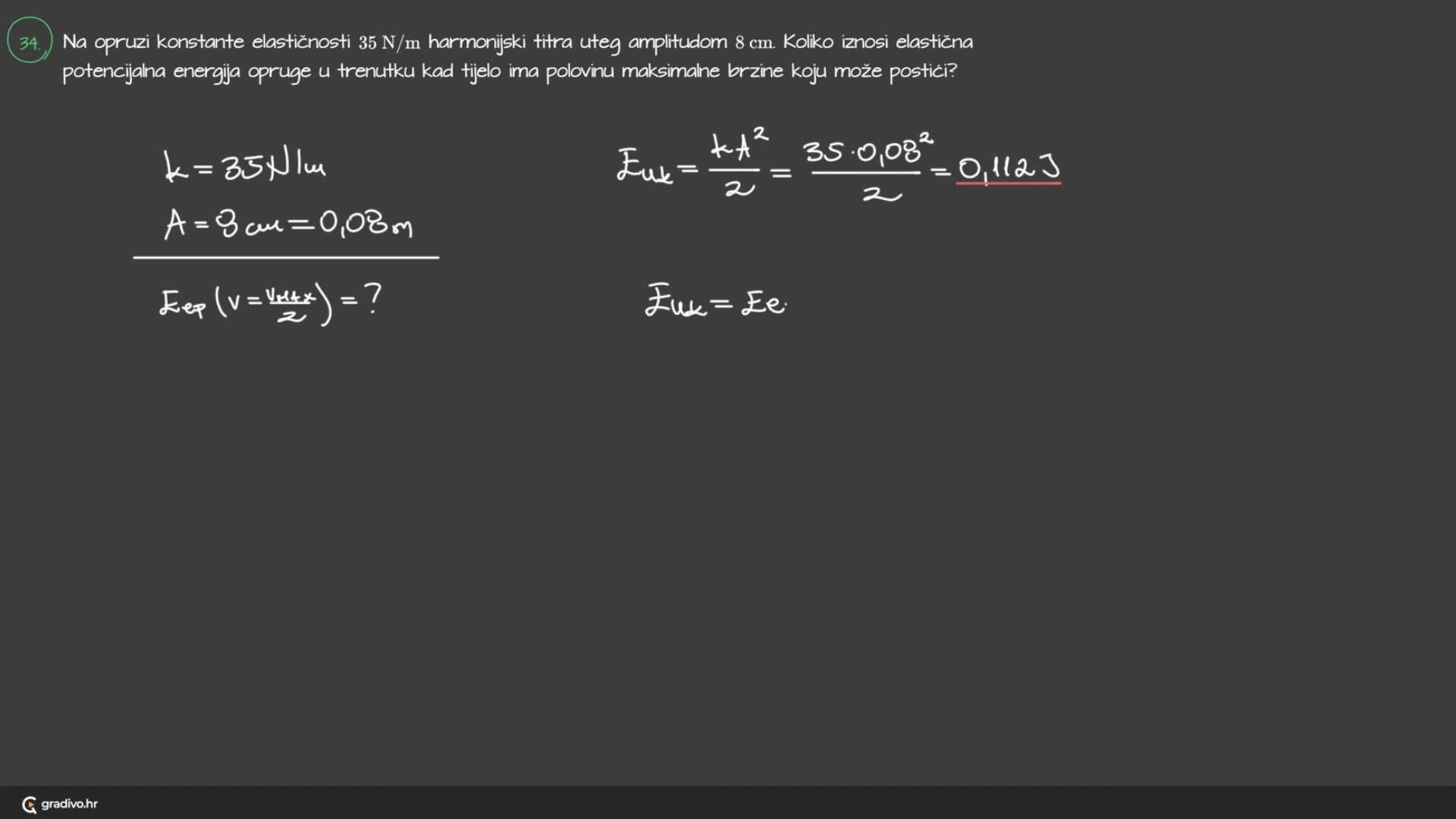 Na opruzi konstante elastičnosti $35 \mathrm{~N} / \mathrm{m}$ harmonijski titra uteg amplitudom 8 cm . Koliko iznosi elastična potencijalna energija opruge u trenutku kad tijelo ima polovinu maksimalne brzine koju može postići?