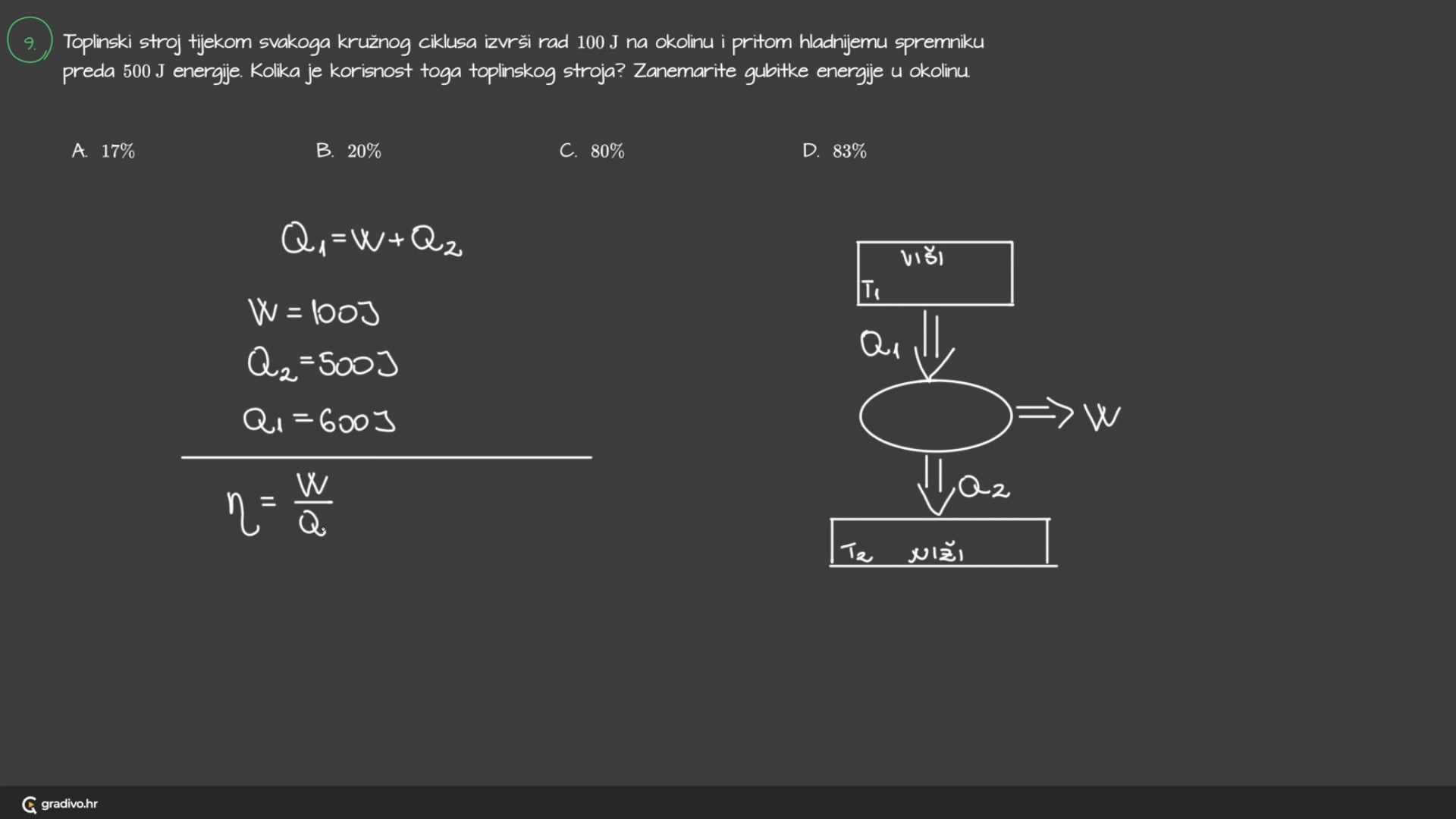 Toplinski stroj tijekom svakoga kružnog ciklusa izvrši rad 100 J na okolinu i pritom hladnijemuspremniku preda 500 J energije. Kolika je korisnost toga toplinskog stroja?Zanemarite gubitke energije u okolinu.
