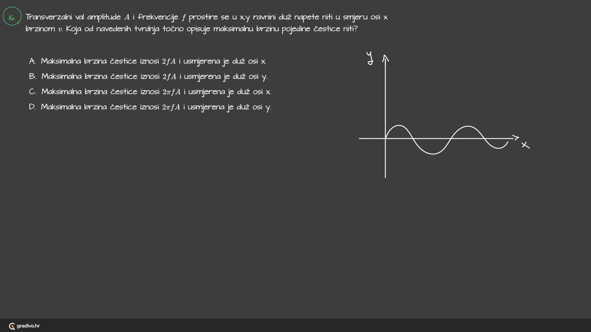 Transverzalni val amplitude $A$ i frekvencije $f$ prostire se u $\mathrm{x}, \mathrm{y}$ ravnini duž napete niti u smjeru osi x brzinom $v$. Koja od navedenih tvrdnja točno opisuje maksimalnu brzinu pojedine čestice niti?