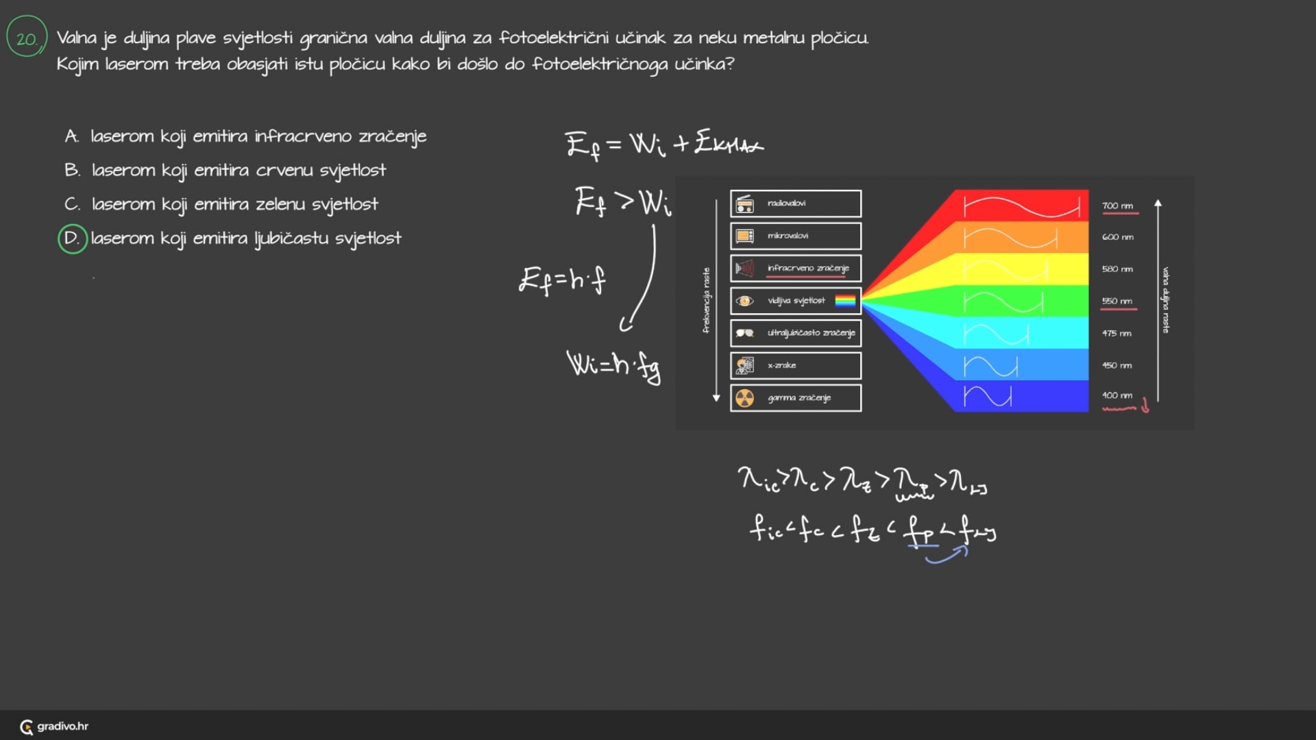 Valna je duljina plave svjetlosti granična valna duljina za fotoelektrični učinak za neku metalnu pločicu. Kojim laserom treba obasjati istu pločicu kako bi došlo do fotoelektričnoga učinka?