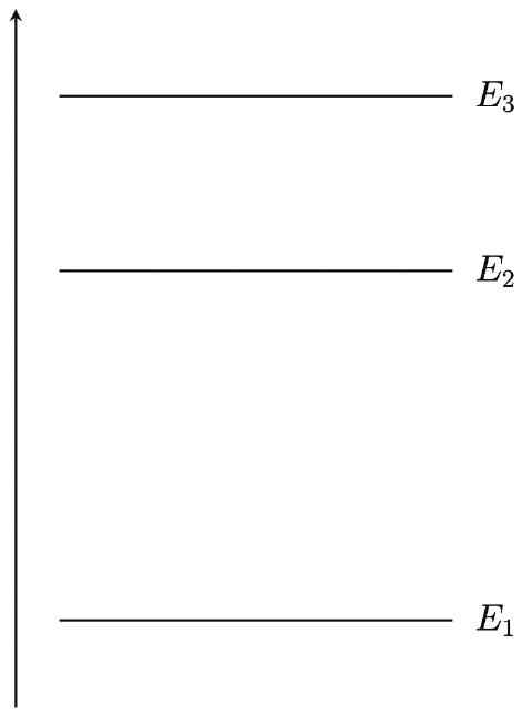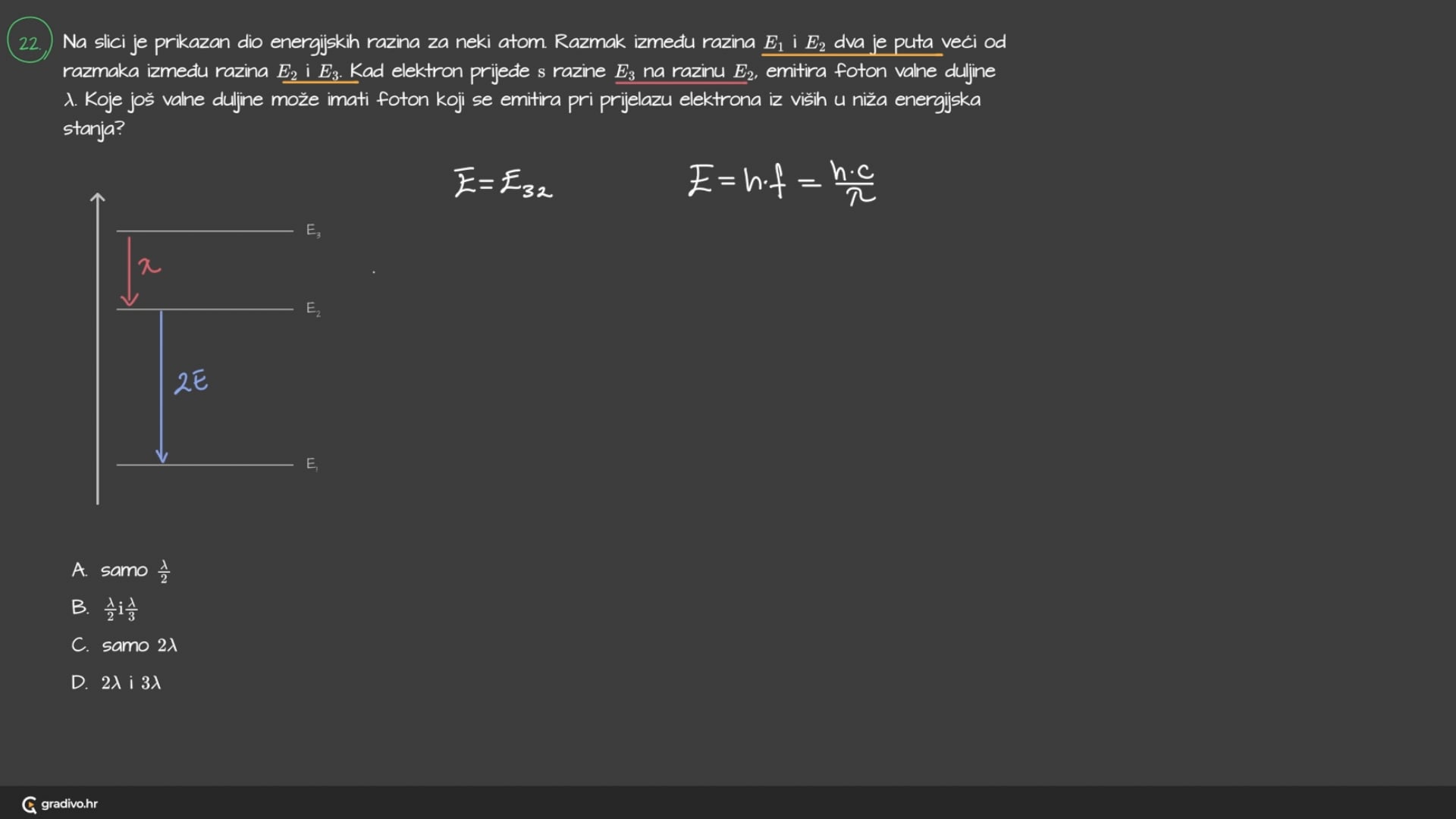 Razmak između razina $E_1$ i $E_2$dva je puta veći od razmaka između razina $E_{2}$ i $E_3$. Kad elektron prijeđe s razine $E_{3}$ na razinu $E_{2}$, emitira foton valne duljine $\lambda$. Koje još valne duljine može imati foton koji se emitira pri prijelazu elektrona iz viših u niža energijska stanja?