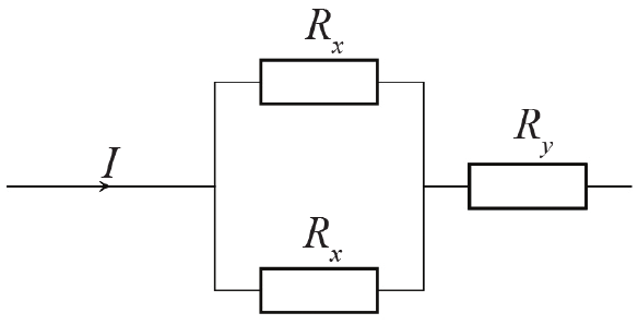 Na slici je prikazan dio strujnoga kruga s otporima $R_{\mathrm{x}}$i $R_{\mathrm{y}}$ jednakih iznosa.