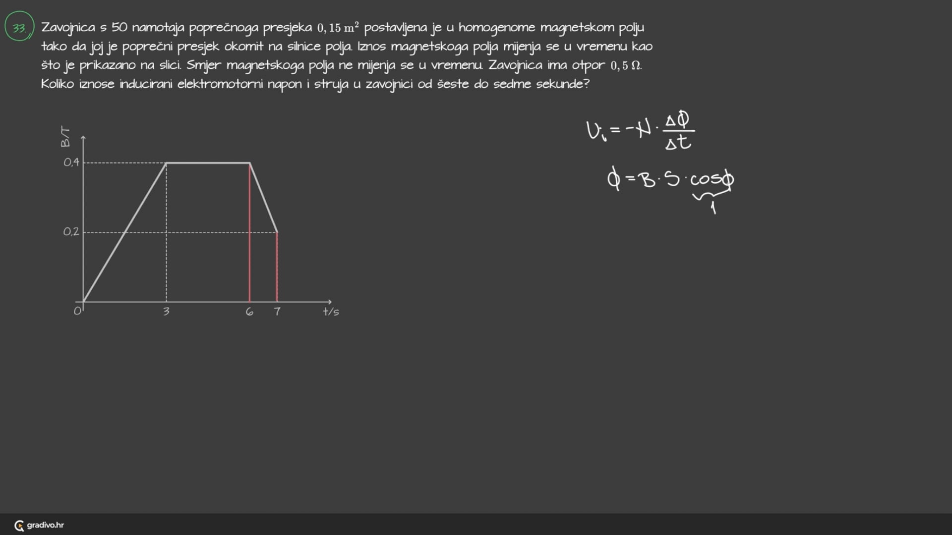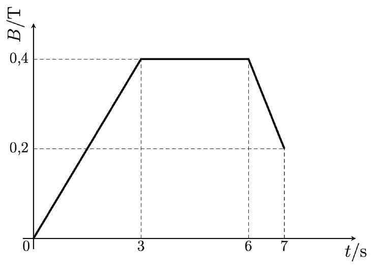 Zavojnica s 50 namotaja poprečnoga presjeka $0,15 \mathrm{~m}^{2}$ postavljena je u homogenome magnetskom polju tako da joj je poprečni presjek okomit na silnice polja. Iznos magnetskoga polja mijenja se u vremenu kao što je prikazano na slici. Smjer magnetskoga polja ne mijenja se u vremenu. Zavojnica ima otpor $0,5 \Omega$.