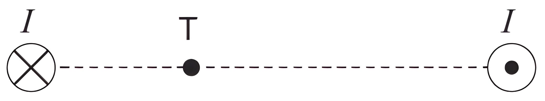 Na slici su prikazana dva duga ravna vodiča kroz koje prolaze struje I u suprotnim smjerovima.Koji od navedenih smjerova točno prikazuje smjer ukupnoga magnetskog polja u točki T?