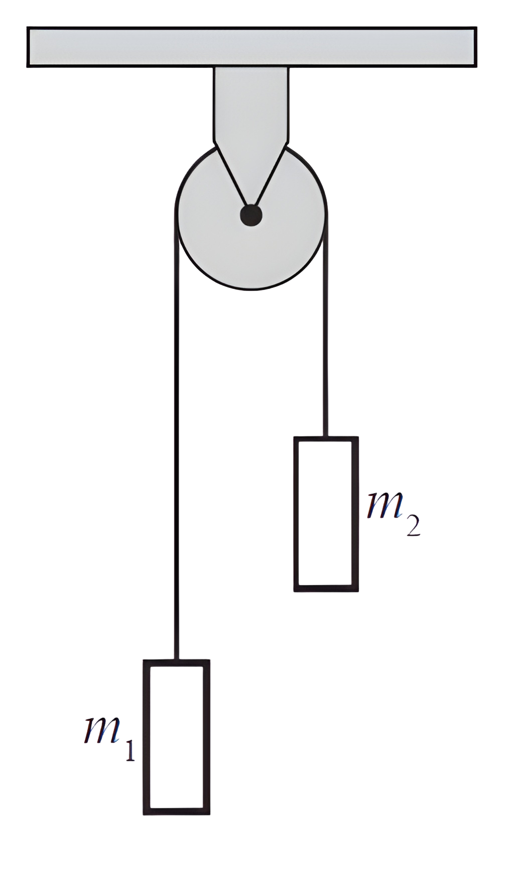 Na slici su prikazana dva utega različitih masa m1 i m2 ovješena na krajevima nerastezljive niti koja je prebačena preko nepomične koloture. Masa utega m1 veća je od mase utega m2.