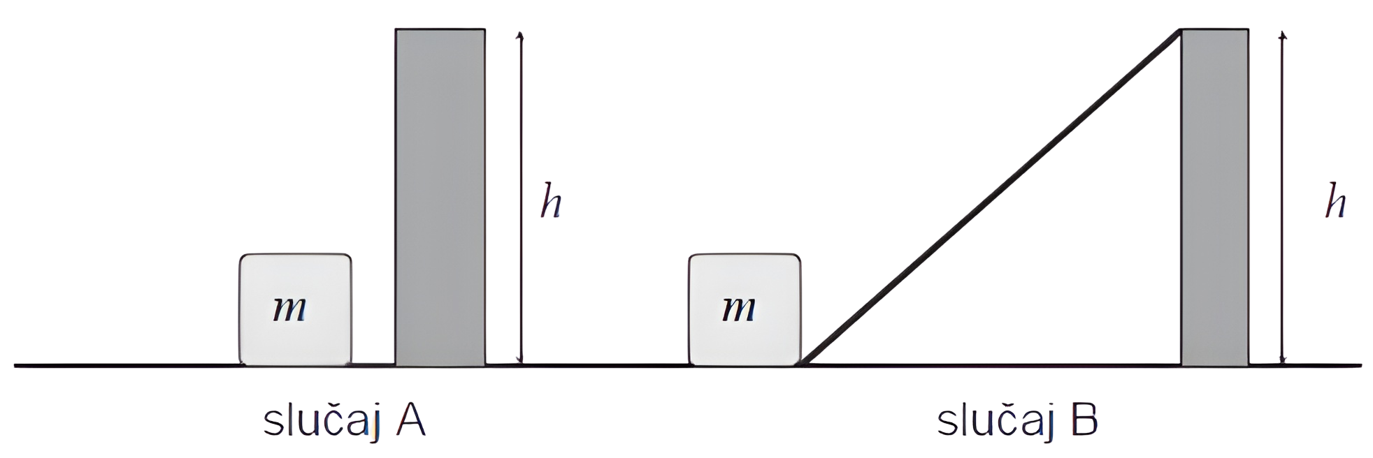 Na slici su prikazana dva slučaja kako se teret mase m može podići na zid visine h. U slučaju A teret se podiže direktno uvis, a u slučaju B teret se jednoliko gura uz kosinu.