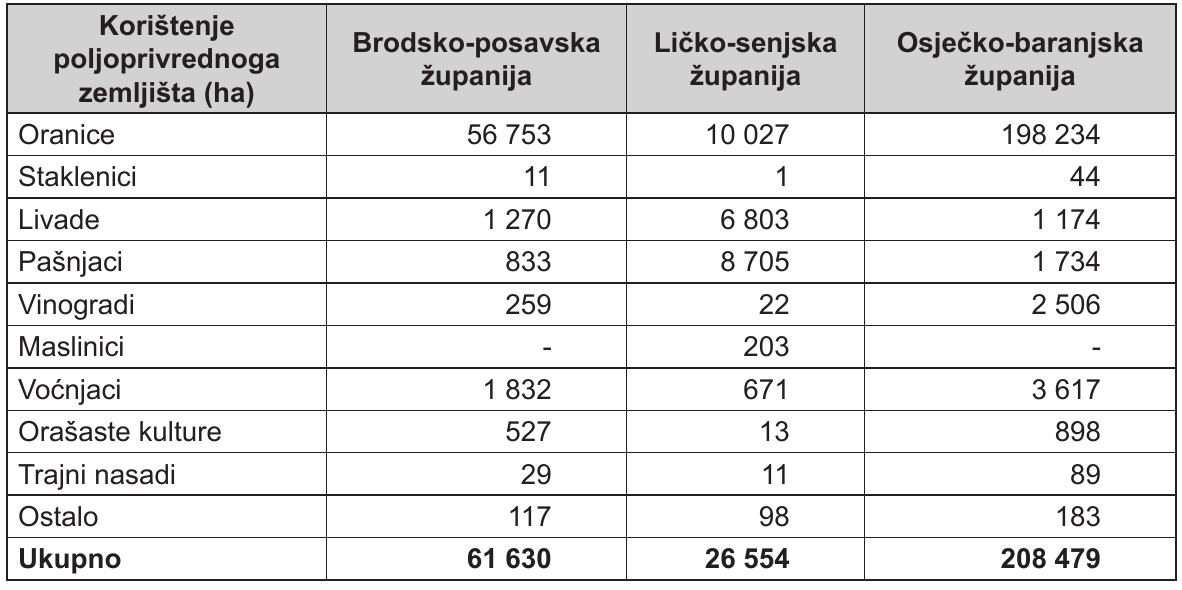 Navedite tri prirodno-geografska faktora i objasnite na koji je način svaki od njih uzrokovao različito korištenje poljoprivrednoga zemljišta u pojedinim županijama.