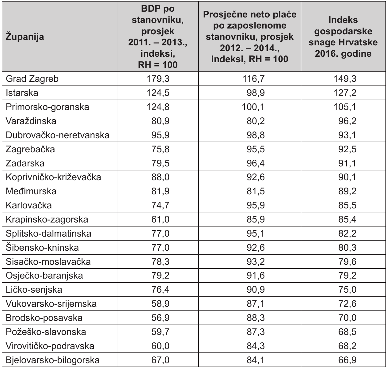 Tab. 1. Indeks gospodarske snage Republike Hrvatske 2016. godine, BDP po stanovniku 2011. - 2013. i neto plaće po zaposlenome stanovniku Hrvatske 2012. - 2014. godine