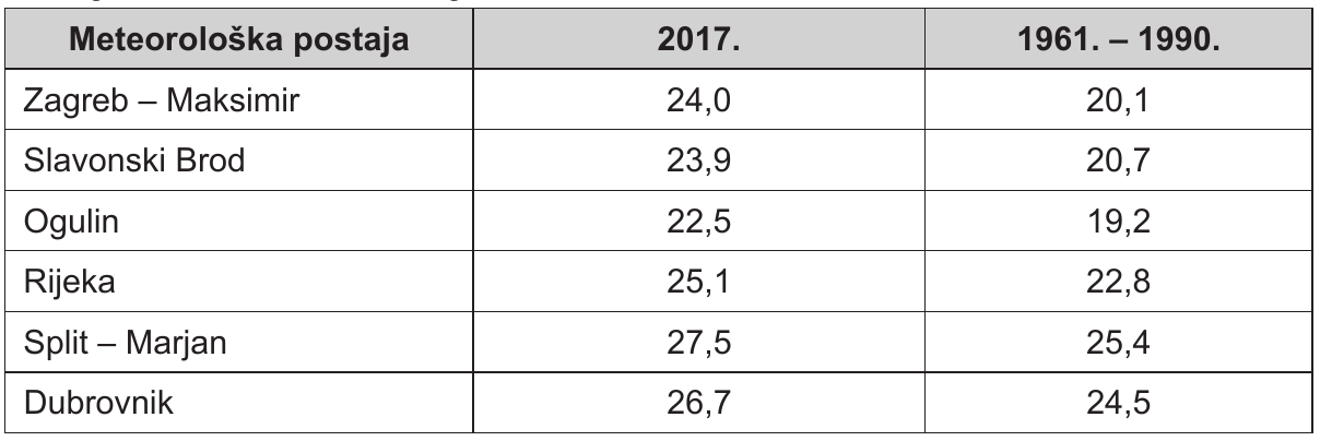 Tab. 2. Srednje srpanjske temperature zraka (°C) u odabranim meteorološkim postajama u2017. godini i od 1961. do 1990. godine