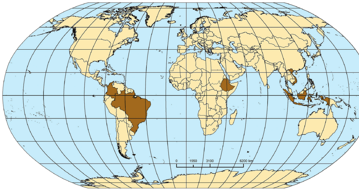 Na karti su smeđe obojene države najveći proizvođači kave 2016. godine. Kako se naziva toplinski pojas za koji je karakteristična proizvodnja kave?