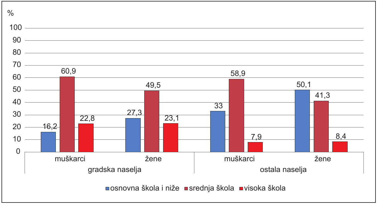 Koji je naziv stupnja obrazovanja u kojemu je najveća relativna razlika u gradskim naseljima između muškaraca i žena?