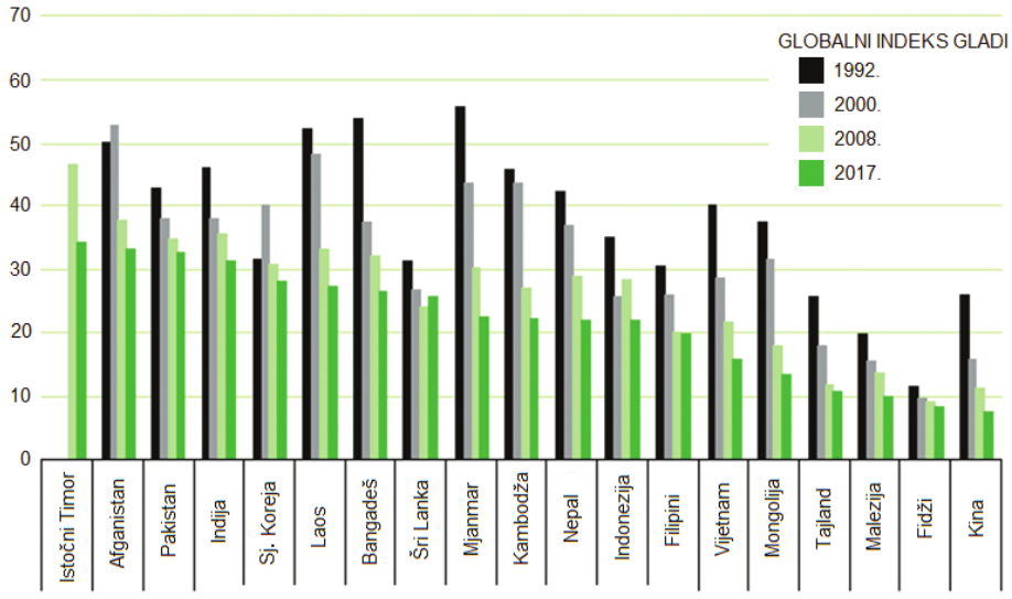 U kojoj je državi Južne Azije ostvaren najmanji napredak u smanjenju globalnoga indeksa gladi u razdoblju od 1992. do 2017. godine?